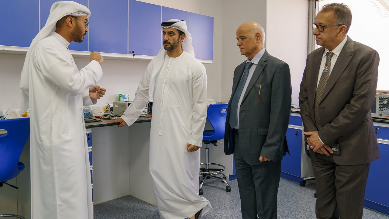 The President of the University of Sharjah also watched the working mechanism of the engineering model of the composite satellite "SharjahSat 1", which simulates the previously launched composite satellite, as is tested in the laboratory to ensure its effectiveness before the original composite satellite is given orders.