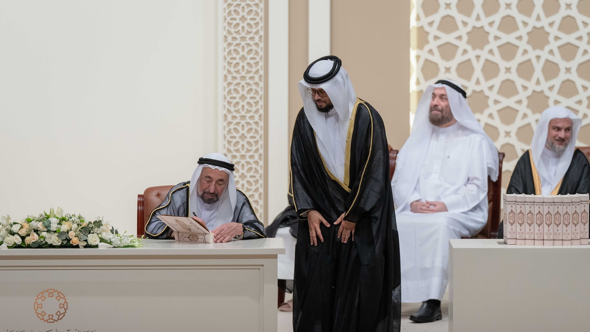 This came during His Highness’ attendance of the graduation annual ceremony of the 5th batch of the certified Qura'a (Holy Quran reciters) from the Holy Quran Academy in Sharjah, which was held in the University City Hall, where His Highness signed the first volumes of the encyclopedia of the Holy Quran Rhetorical Interpretation.