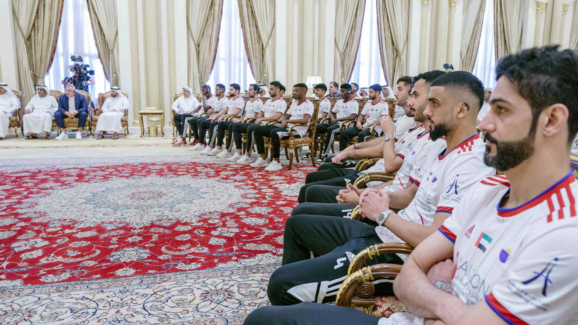 His Highness congratulated the Sharjah team on winning the UAE President's Cup, including management, players and coaches, praising the great level presented by the players during the match, along with the Al Ain team, which won the admiration of everyone.