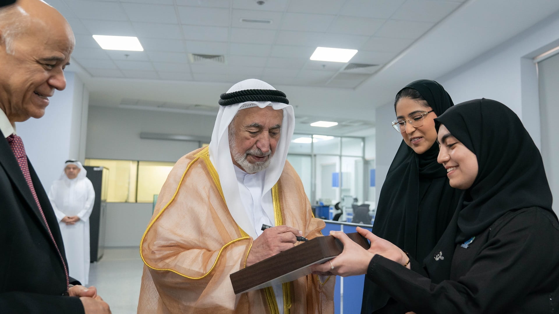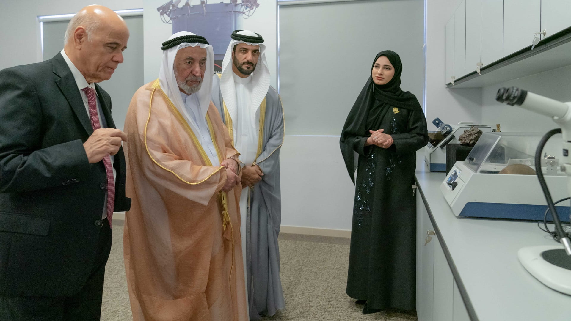 During his tour of the academy, His Highness the Ruler of Sharjah stopped by the Radio Astronomy Laboratory, the Meteorites Centre, the library, and the Centre for Geographic Information Systems and Remote Sensing.