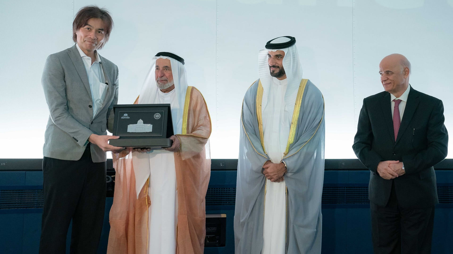 His Highness presented shields and engaged in commemorative photographs with the representatives of the companies that contributed to the design and implementation of the solutions that modernised the Sharjah Planetarium.