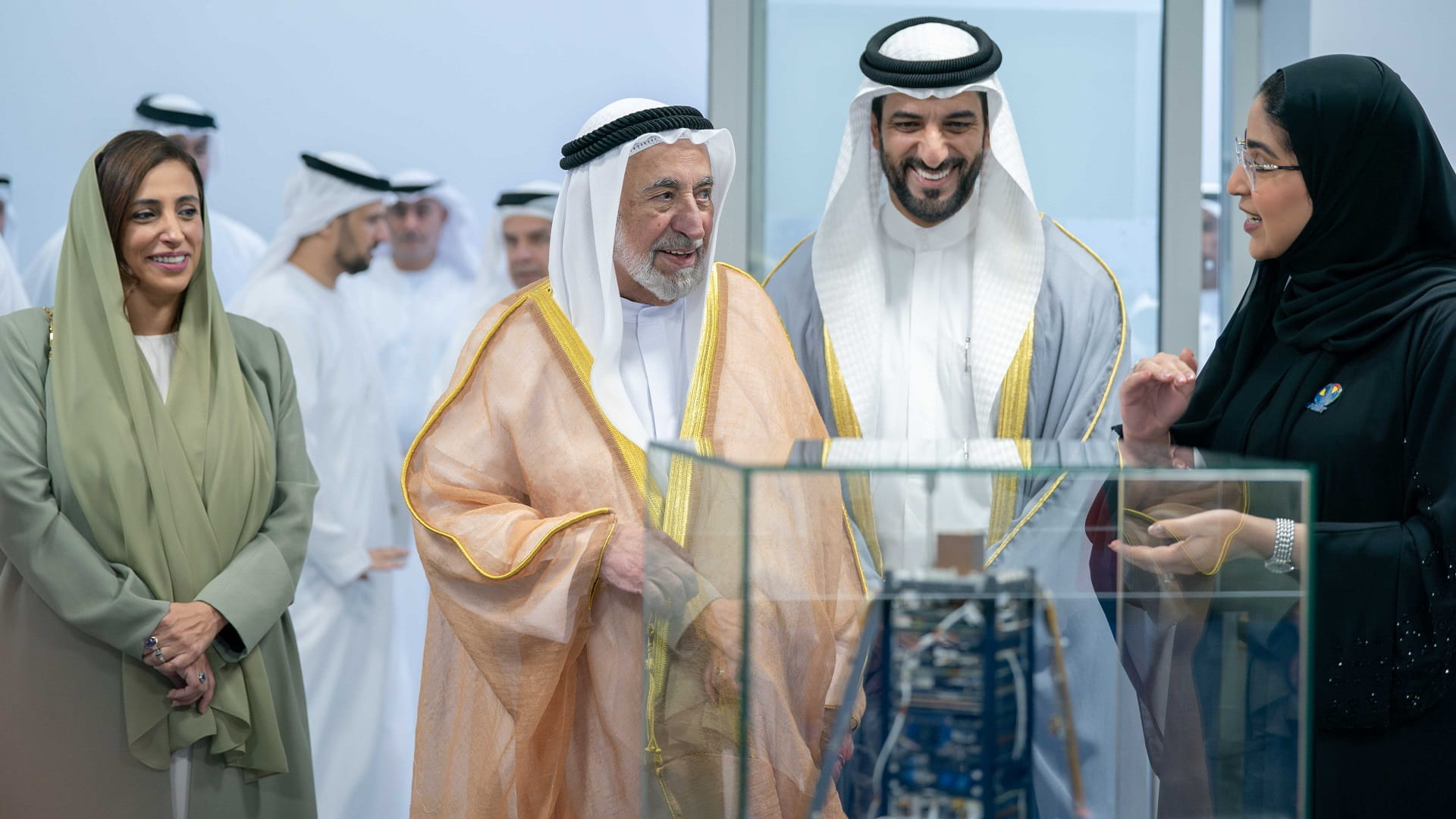 His Highness was given a presentation on the engineering model of the cuboid satellite "Sharjah Sat 1" during his visit to the Mini-Satellite Laboratory. The workings of the cuboid satellite and its most notable features were explained to His Highness.