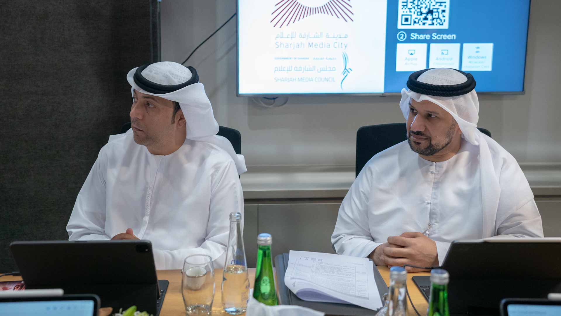 The meeting was attended by Dr. Khaled Omar Al Midfa, Chairman of Sharjah Media City "Shams"; Mohammed Hassan Khalaf, Director General of the Sharjah Broadcasting Authority; Tariq Saeed Allay, Director General of the Sharjah Government Media Bureau; Rashid Abdullah Al Obed, Director of the Sharjah Broadcasting Authority; Shihab Ahmed Al Hammadi, Director of Sharjah Media City "Shams"; Alia Bu Ghanem Al Suwaidi, Director of the Sharjah Government Media Bureau; Hassan Yaqoub Al Mansouri, Secretary General of the Sharjah Media Council, and Hessa Abdullah Al Hammadi, Assistant Secretary General of the Sharjah Media Council.