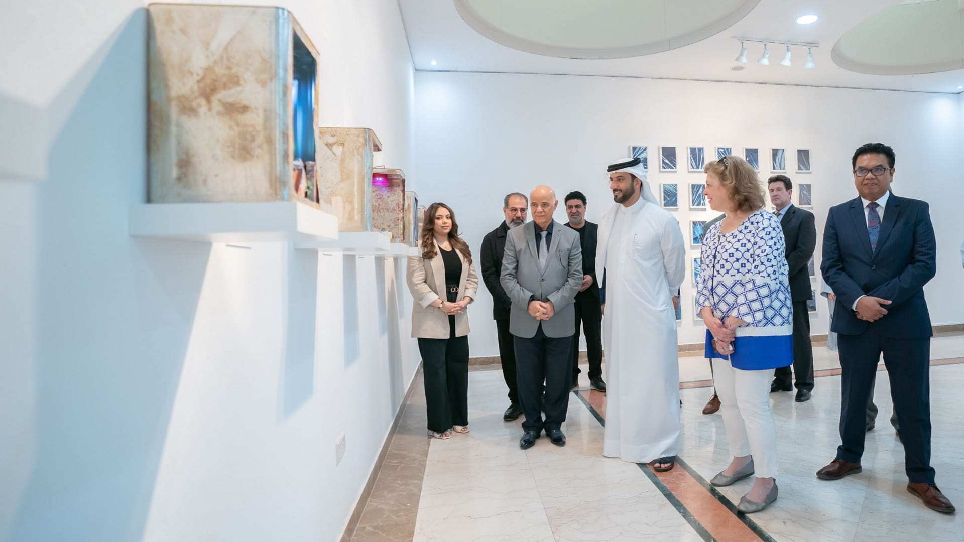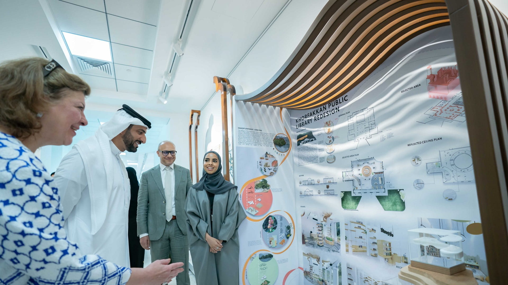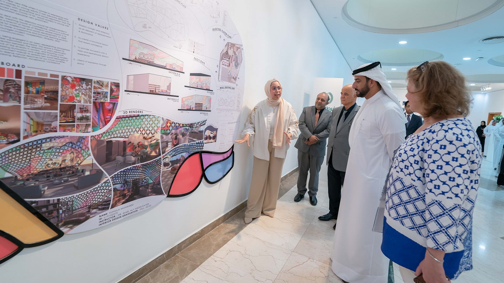 Sheikh Sultan bin Ahmed toured the exhibition where the students’ graduation projects were presented: interior design (34 projects), fashion and textile design (4 projects), visual communication (23 projects), and the fine arts department (5 projects).