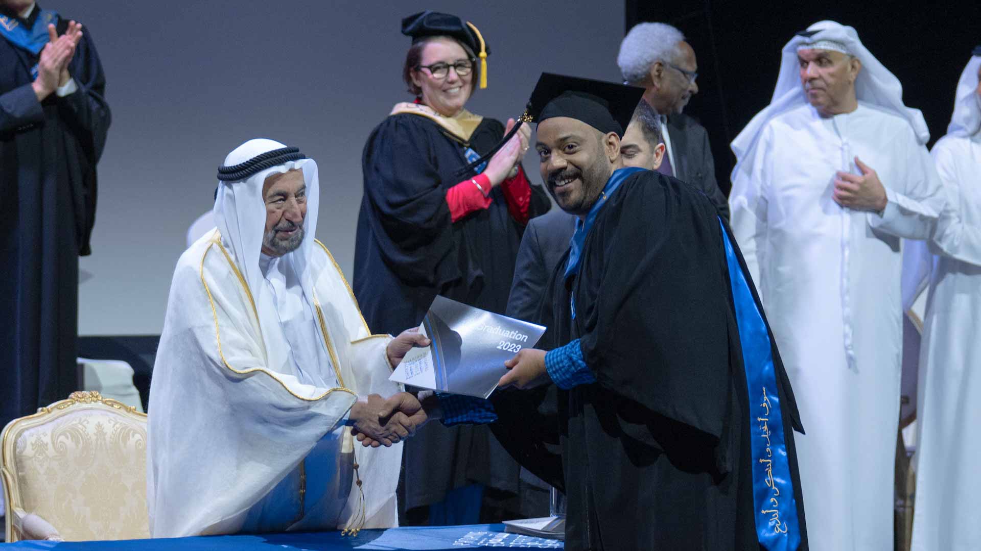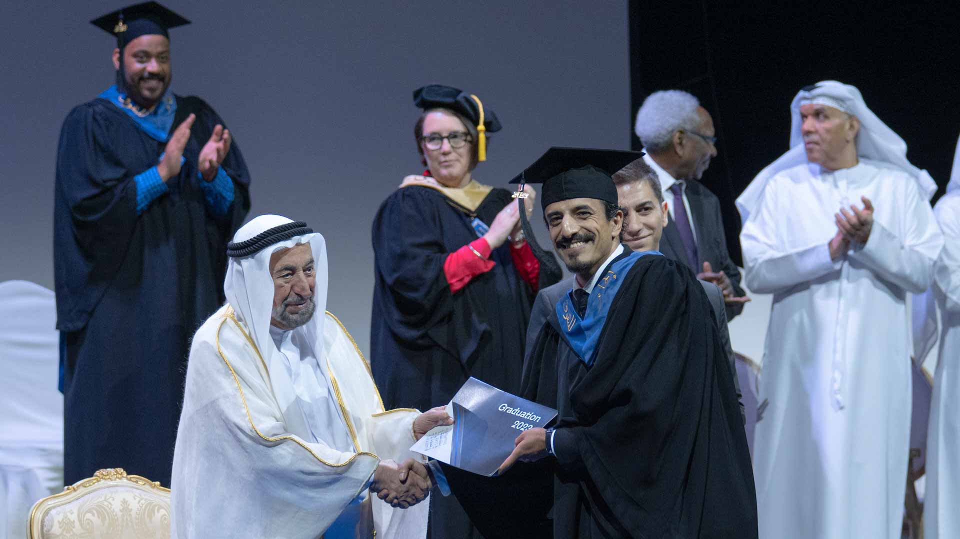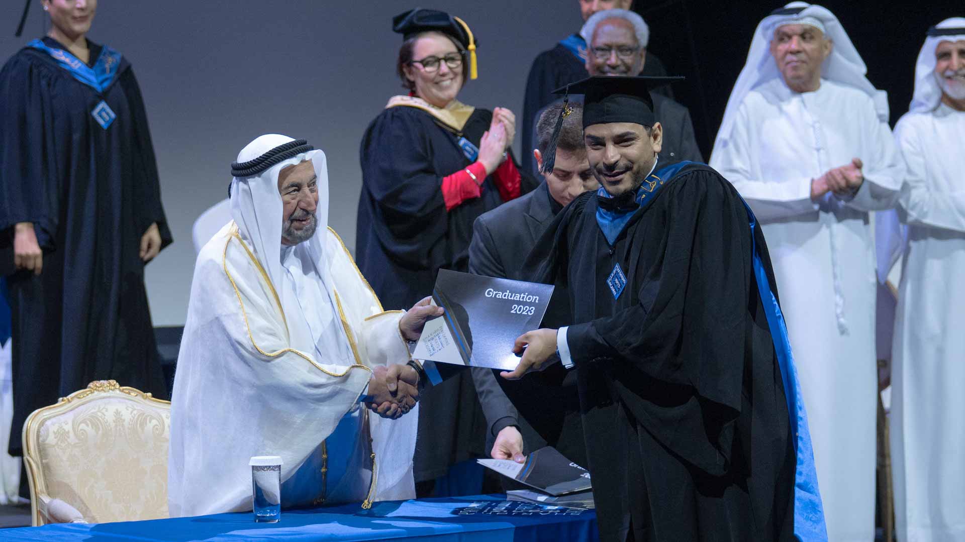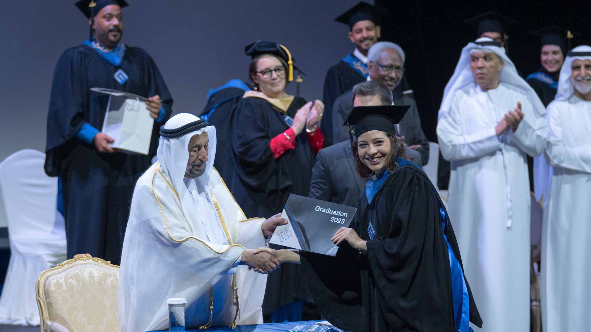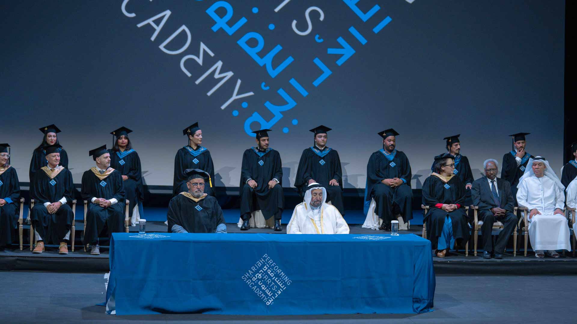 Attending the graduation ceremony alongside His Highness the Ruler of Sharjah were Khamis bin Salem Al Suwaidi, Advisor at the Office of His Highness the Ruler; Khalid Jassim Al Midfa, Chairman of the Sharjah Commerce and Tourism Development Authority; Dr. Mansour Mohammed bin Nassar, Head of Sharjah Government Legal Department; Mohammed Obaid Al Zaabi, Head of the Protocol and Hospitality Department; several members of the Board of Trustees of the Sharjah Performing Arts Academy, faculty members and parents of graduates.