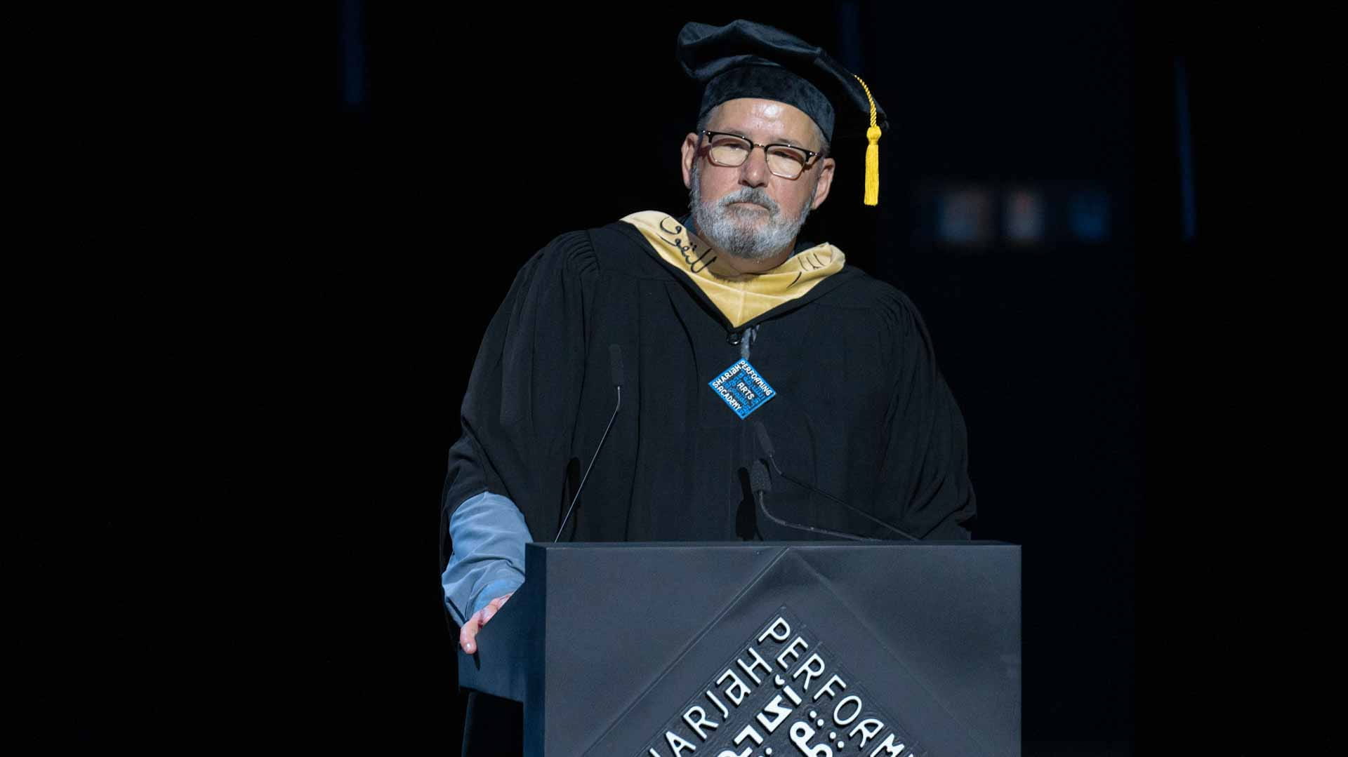 The Executive Director of the Sharjah Performing Arts Academy, Professor Peter Barlow, gave a speech in which he lauded the efforts of His Highness Sheikh Dr. Sultan bin Mohammed Al Qasimi to establish a unique theatrical, educational, and practical experience in the region through the Academy, as well as His Highness's unrelenting support since the Academy's inception through the graduation of its first batch.