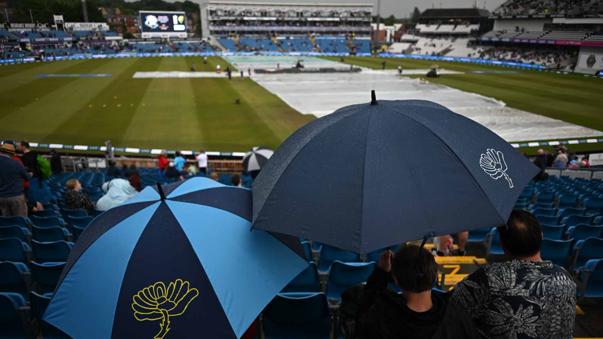 Play should have resumed at 1000 GMT but heavy morning rain meant the pitch and square at Yorkshire's headquarters in Leeds remained fully covered.