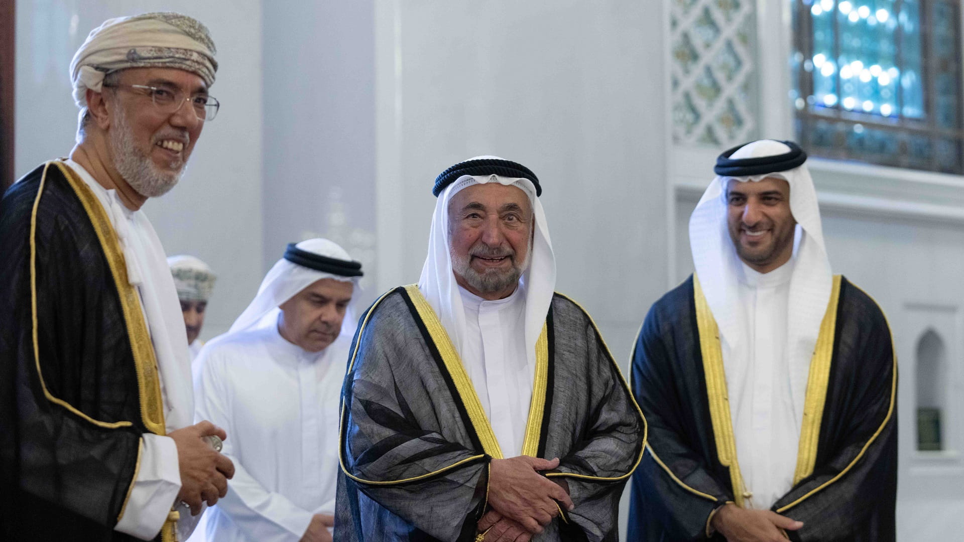 Then, His Highness Sheikh Dr. Sultan bin Mohammed Al Qasimi and the crowds of worshipers performed the Maghrib prayer at the Sultan Qaboos Grand Mosque.
