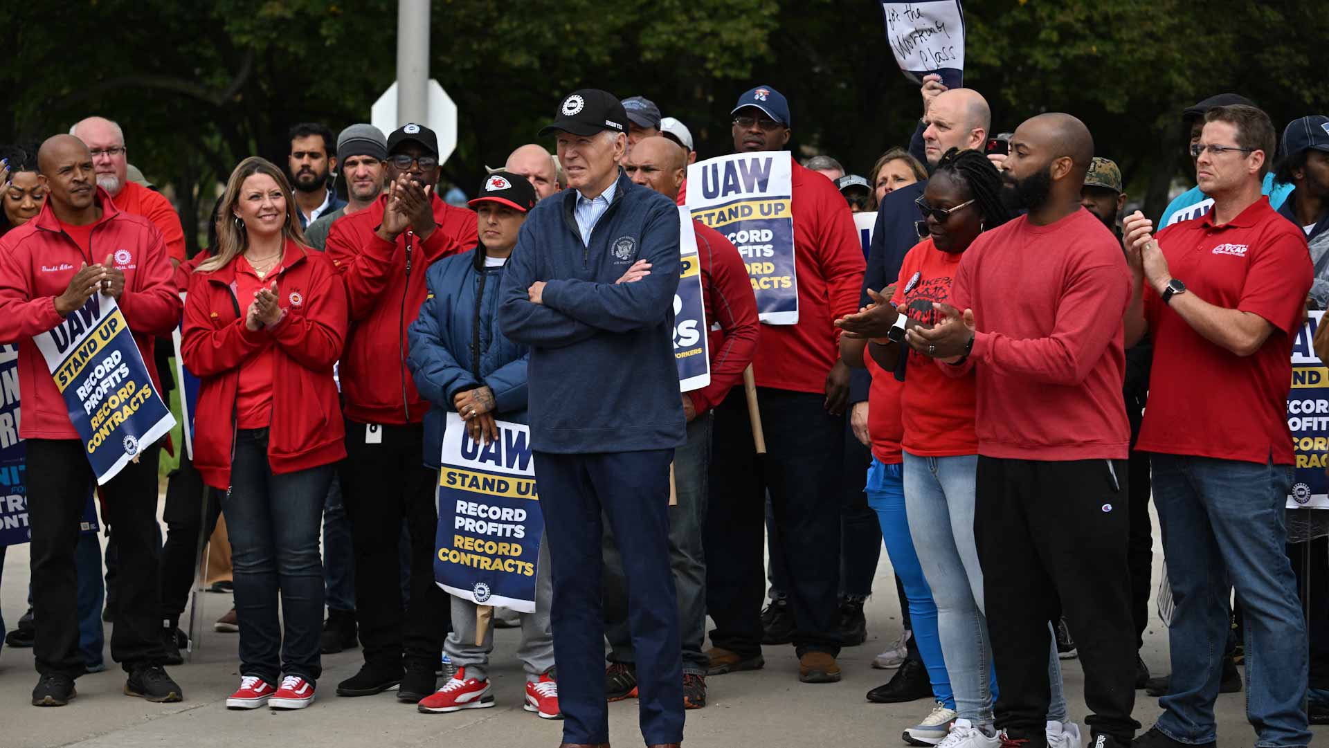 "Our president chose to stand up with workers," Fain, whose union is pushing the car makers for better pay and conditions, told the crowd.