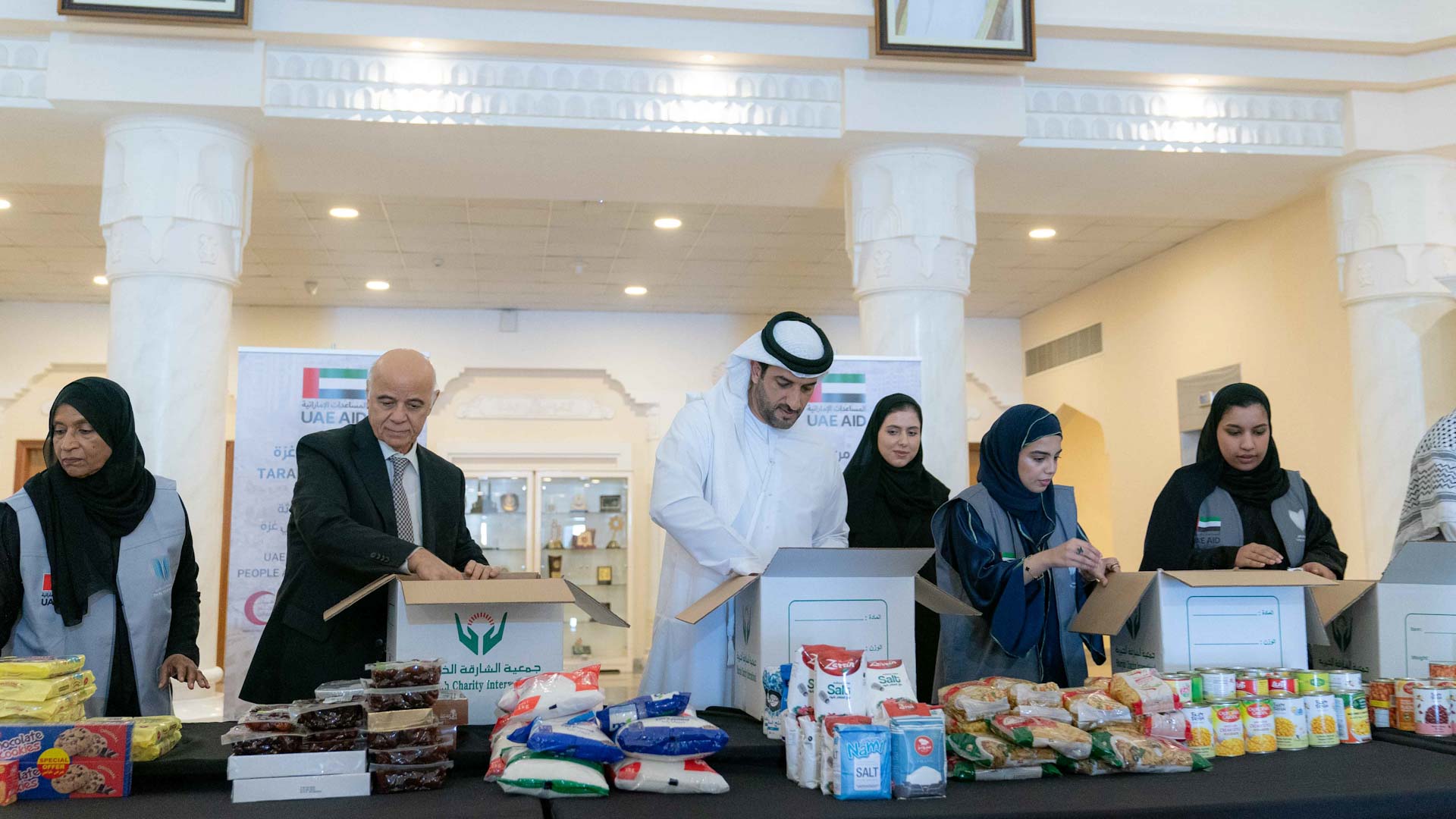 Sultan bin Ahmed was briefed on the great efforts made by campaign's organizing members and volunteers who contributed to providing urgent relief packages to the affected Palestinian children and families, which mirrors the firm solidarity with the brotherly Palestinian people and embodies the spirit and values of goodness and feelings of brotherhood towards our Arab brothers.