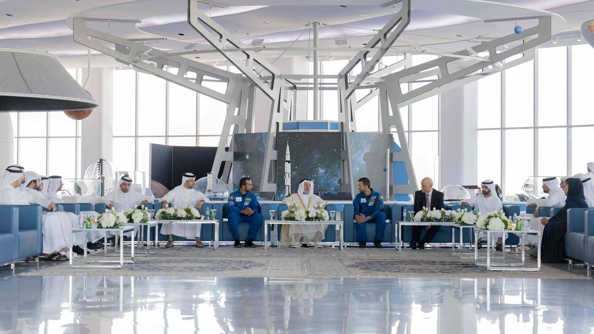 His Highness received from astronaut Sultan Alneyadi the flag of the UAE, which accompanied him during his mission aboard the International Space Station, calling on the scientific team to continue their efforts in order to achieve more scientific achievements that distinguish youth of the UAE.