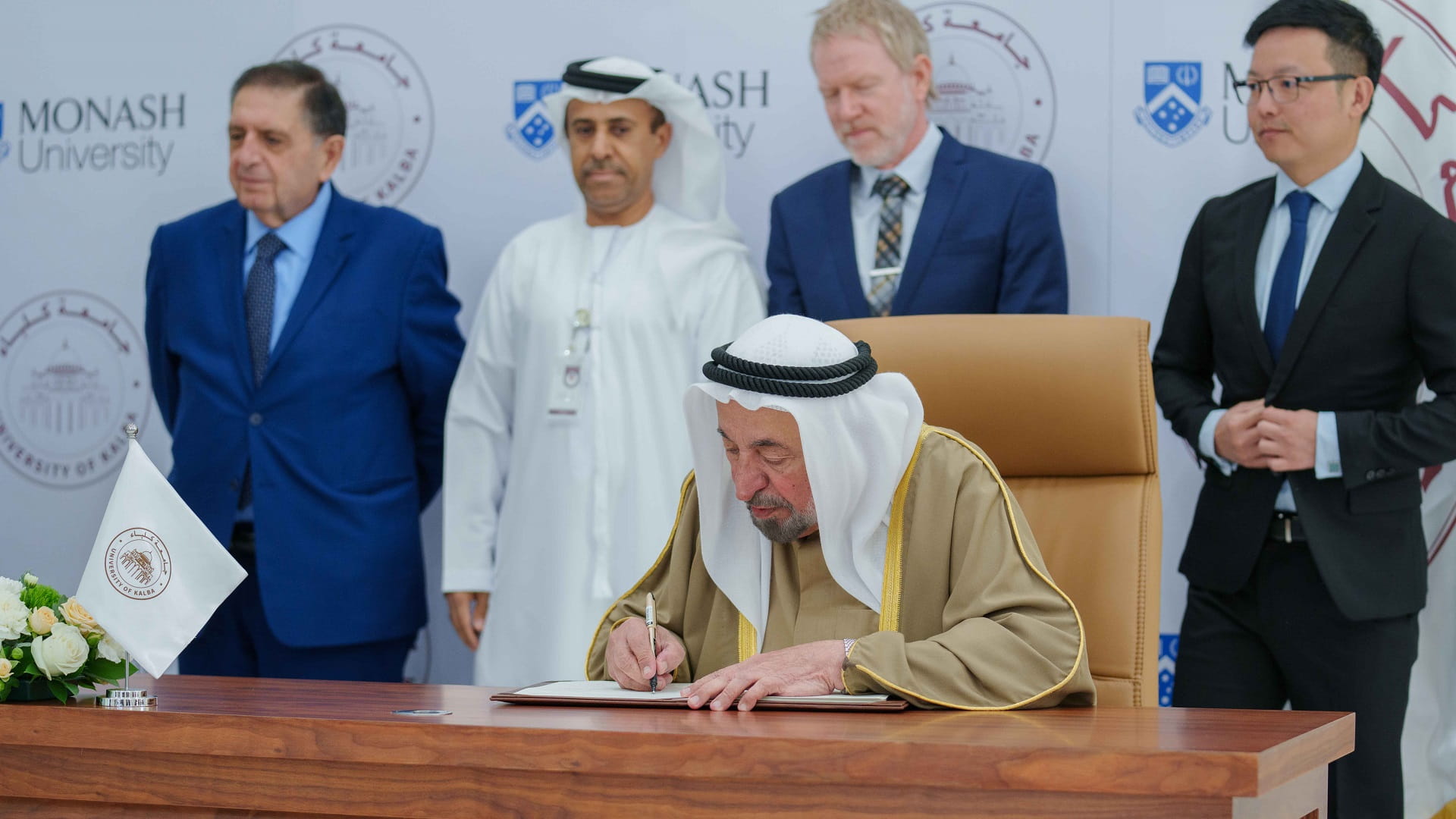 The agreement signing ceremony was attended by Dr. Salah bin Butti Al Muhairi, Chairman of the Initiatives Implementation Authority; Mohammed Obaid Al Zaabi, Chairman of Protocol Department; Her Excellency Dr. Muhadditha Al Hashimi, Chairperson of the Sharjah Private Education Authority; Dr. Saif Salem Al-Qaidi, Director of University of Kalba ; Hamid Majoul Al Nuaimi, the University of Sharjah Chancellor; Dr. Ahmed Al Shamaa, Director of University of Khorfakkan, and a number of members of the Board of Trustees of Kalba University and representatives of Monash University in Australia.