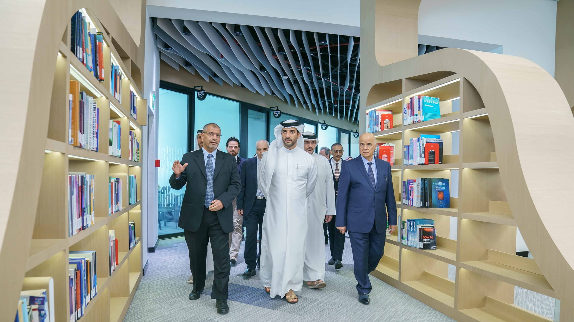 Sheikh Sultan bin Ahmed toured the corridors of the library, which embodies the modern design concept of libraries in terms of the design of shelves and colours to create a calm environment for the place. He learned about the library’s facilities, such as group and individual study halls, open sessions, and multimedia rooms.