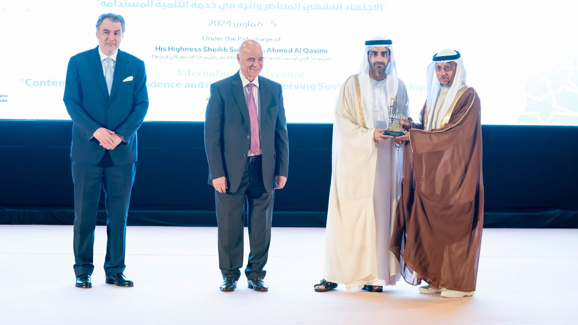 The Chairman of Sharjah Ruler's Office and the conference attendees watched a visual presentation that covered the academic programmes offered by the College of Sharia and Islamic Studies, and the intellectual projects it organises to discuss legal and jurisprudential topics. At the end of the opening of the conference, Sheikh Salem bin Abdulrahman Al Qasimi honored the speakers and sponsors of the conference.