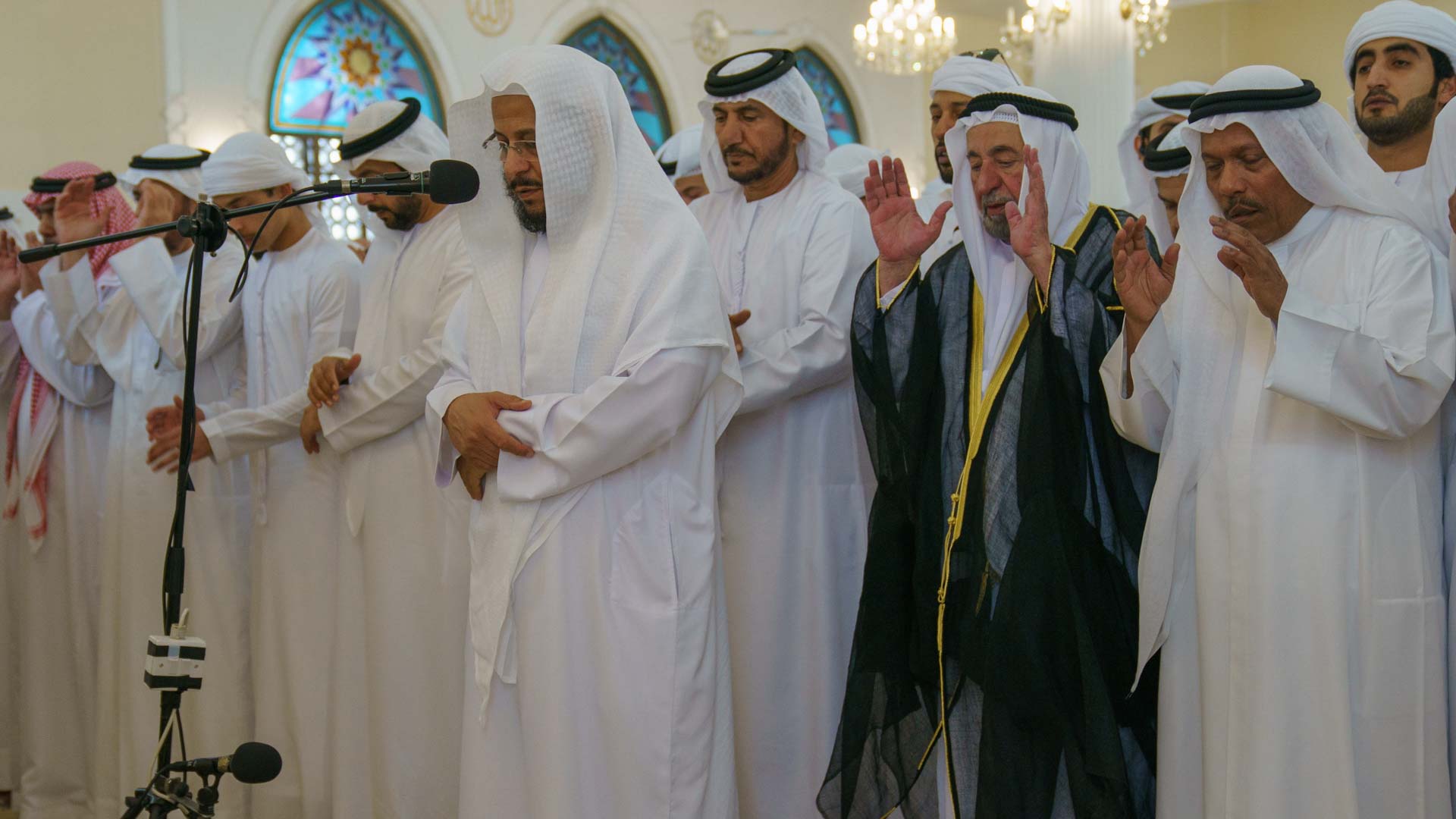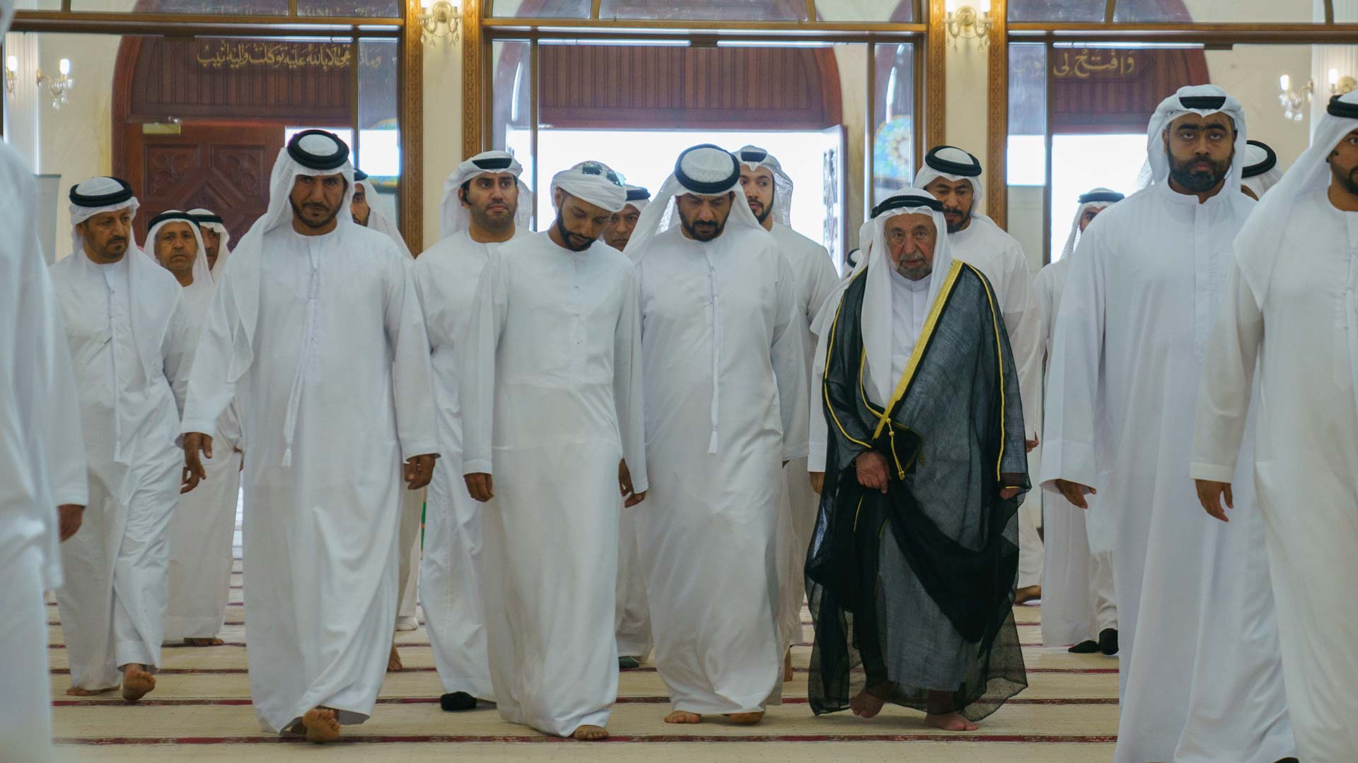 Also present were Sheikh Abdullah bin Mohammed Al Thani, Advisor to the Ruler's Office, Sheikh Essam bin Saqr Al Qasimi, Advisor to the Ruler’s Office, Sheikh Khalid bin Abdullah Al Qasimi, Chairman of Sharjah Seaports, Customs and Free Zones, Sheikh Khalid bin Essam Al Qasimi, Chairman of the Department of Civil Aviation, Sheikh Majid bin Sultan Al Qasimi, chairman of Districts and Villages Affairs Department, Sheikh Abdullah bin Majid Al Qasimi, President of the Sharjah Equestrian and Racing Club, Sheikh Khalid bin Saqr Al Qasimi, Chairman of the Prevention and Safety Authority , Sheikh Mohammed bin Ahmed Al Qasimi, Deputy Chairman of the Oil Council, Sheikh Majid bin Abdullah Al Qasimi, Director of the Department of Government Relations (DGR) in Sharjah, Sheikh Mohammed bin Abdullah bin Majid Al Qasimi, Director of the Municipal Affairs Department, along with members of Al Qawasim family, dignitaries, and a gathering of worshippers.