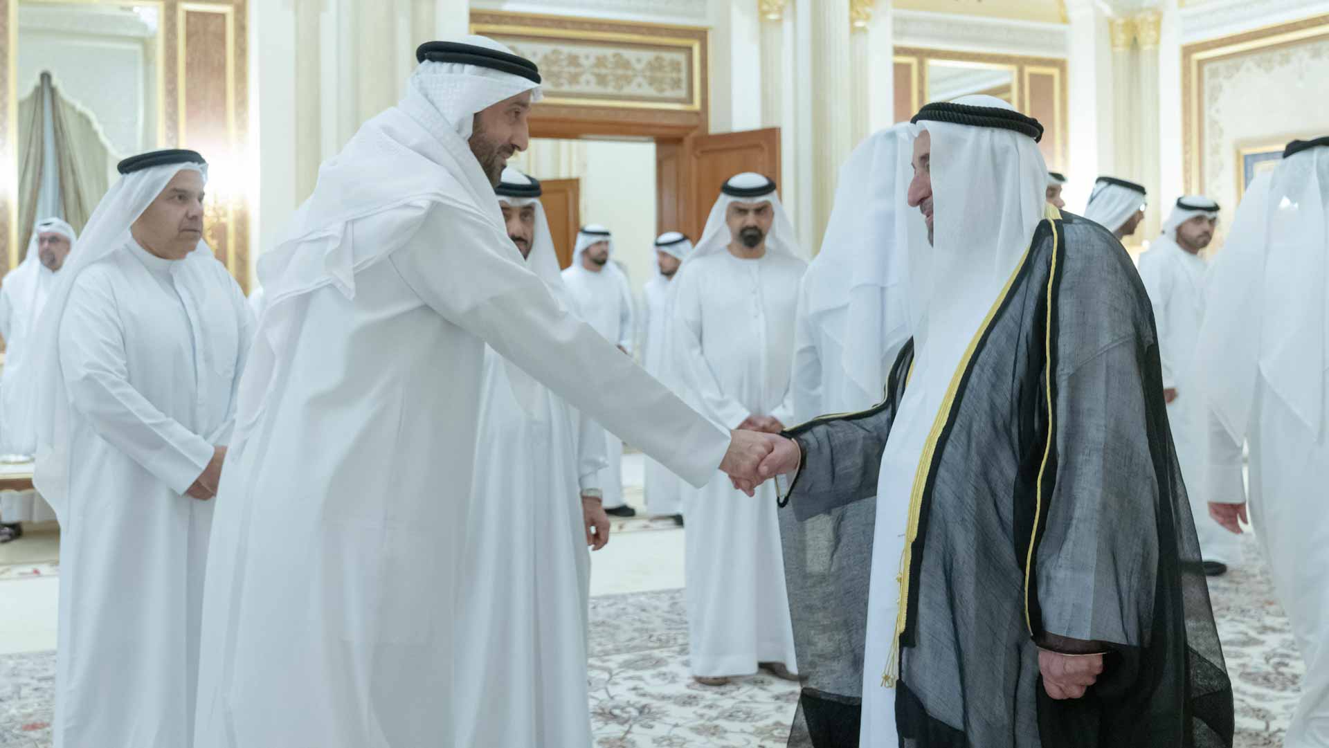 His Highness received congratulations and blessings on this great religious occasion from Abdulla bin Touq, Minister of Economy, and Dr. Omar Habtoor Al Darei, Chairman of the General Authority for Islamic Affairs and Endowments along with senior officials, members of the Sharjah Consultative Council, delegations from governmental bodies and institutions, dignitaries, tribal people, citizens, and representatives of expatriate communities.