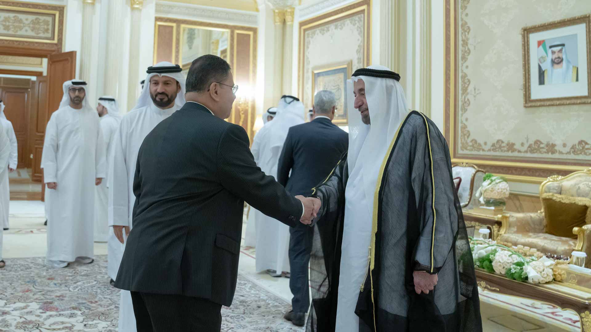 Present at the reception alongside His Highness the Ruler of Sharjah were Sheikh Mohammed bin Saud Al Qasimi, the Chairman of the Sharjah Finance Department; Sheikh Khalid bin Abdullah Al Qasimi, Chairman of the Sharjah Seaports, Customs and Free Zones Authority; Sheikh Salem bin Abdulrahman Al Qasimi, Chairman of the Sharjah Ruler’s Office; Sheikh Khalid bin Issam Al Qasimi, Chairman of the Sharjah Department of Civil Aviation; Sheikh Fahim bin Sultan Al Qasimi, Chairman of the Government Relations Department; Sheikh Mohammed bin Humaid Al Qasimi, Chairman of the Department of Statistics and Community Development; Sheikh Saqr bin Mohammed Al Qasimi, Chairman of the Board of Directors of the Sharjah Charity International; Sheikh Abdullah bin Mohammed Al Qasimi, Director of the General Authority of Islamic Affairs and Endowments in Sharjah; Dr Abdullah Belhaif Al Nuaimi, Chairman of Sharjah Consultative Council; Rashid Ahmed bin Al Shaikh, Chairman of Sharjah Ruler Court (Amiri Diwan); as well as heads of departments and government entities.