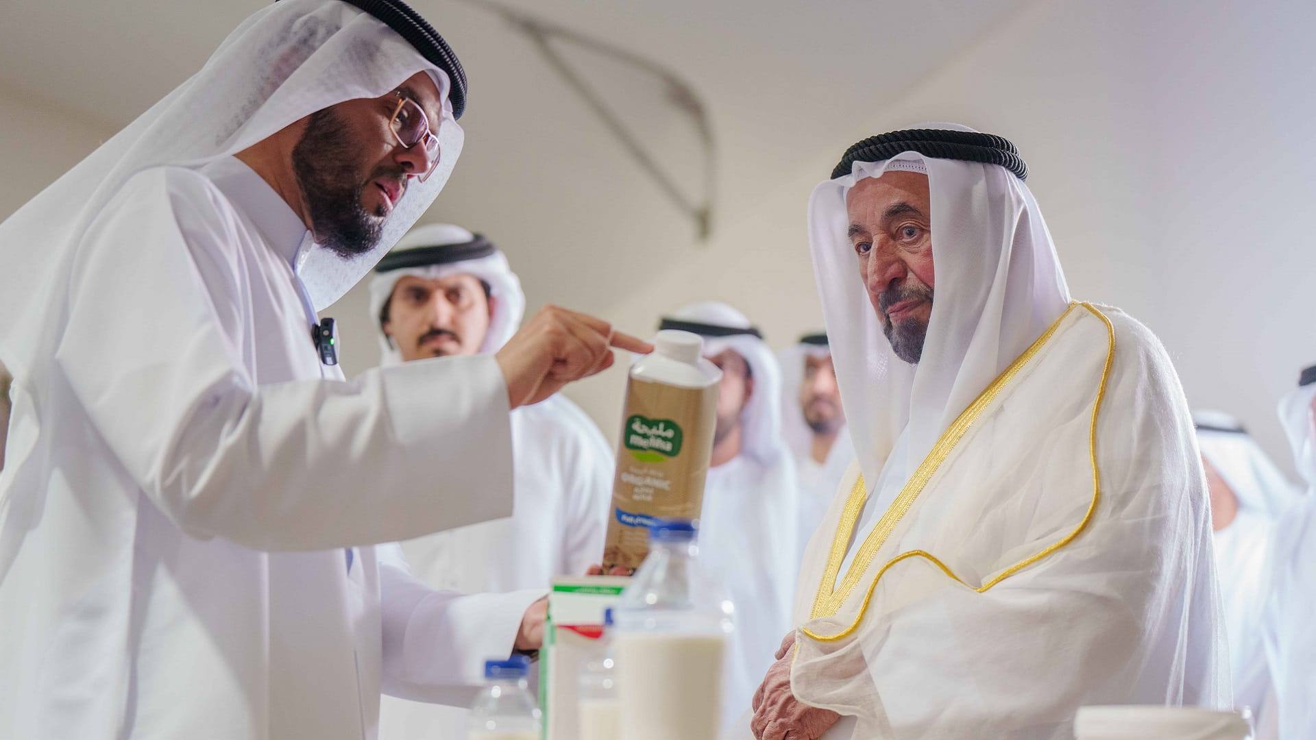 His Highness the Ruler of Sharjah toured the farm facilities, built on an area of three million and seventy-seven thousand square metres, and include purebred Holstein cows, the first of their kind in the Middle East, which produce A2A2 protein organic milk.