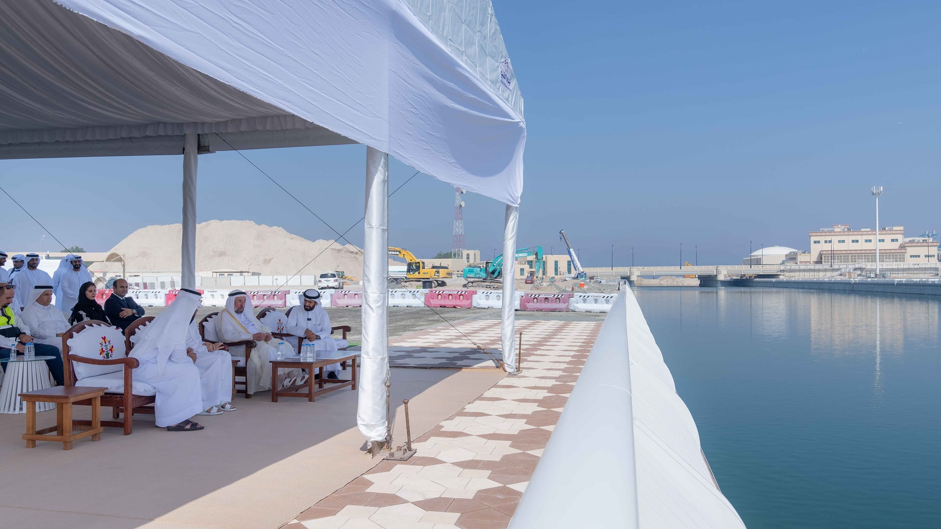 His Highness received a detailed explanation of the completion process of the breakwater and the canal tests to ensure the safety of the structures under extreme conditions and hurricanes and to ensure the effectiveness of the canal and the breakwater in facilitating water flow to the island.
