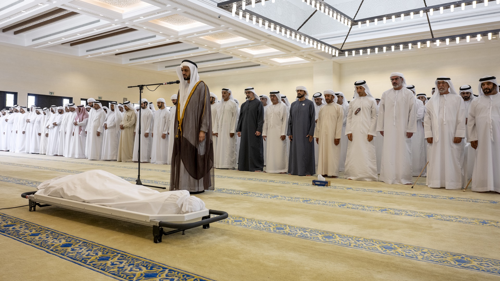 Among the mourners were H.H. Sheikh Khaled bin Mohamed bin Zayed Al Nahyan, Crown Prince of Abu Dhabi; H.H. Sheikh Saif bin Mohammed Al Nahyan; H.H. Sheikh Suroor bin Mohammed Al Nahyan; H.H. Sheikh Nahyan bin Zayed Al Nahyan, Chairman of the Board of Trustees of the Zayed Charitable and Humanitarian Foundation; H.H. Lt. General Sheikh Saif bin Zayed Al Nahyan, Deputy Prime Minister and Minister of the Interior; H.H. Sheikh Hamed bin Zayed Al Nahyan; H.H. Sheikh Omar bin Zayed Al Nahyan, Deputy Chairman of the Board of Trustees of Zayed bin Sultan Al Nahyan Charitable and Humanitarian Foundation; H.H. Sheikh Khalid bin Zayed Al Nahyan, Chairman of the Board of Zayed Higher Organisation for People of Determination (ZHO); H.H. Mohammed bin Khalifa Al Nahyan; H.H. Sheikh Theyab bin Mohamed bin Zayed Al Nahyan, Deputy Chairman of the Presidential Court for Development and Fallen Heros' Affairs; H.H. Sheikh Hamdan bin Mohamed bin Zayed Al Nahyan; H.H. Sheikh Zayed bin Mohamed bin Zayed Al Nahyan; H.H. Sheikh Zayed bin Hamdan bin Zayed Al Nahyan; Sheikh Dr Khalid bin Sultan bin Zayed Al Nahyan; Sheikh Nahyan bin Mubarak Al Nahyan, Minister of Tolerance and Coexistence; Sheikh Mohammed bin Hamad bin Tahnoun Al Nahyan, Advisor for Special Affairs at the Ministry of Presidential Court; a number of Sheikhs, officials and mourners.
