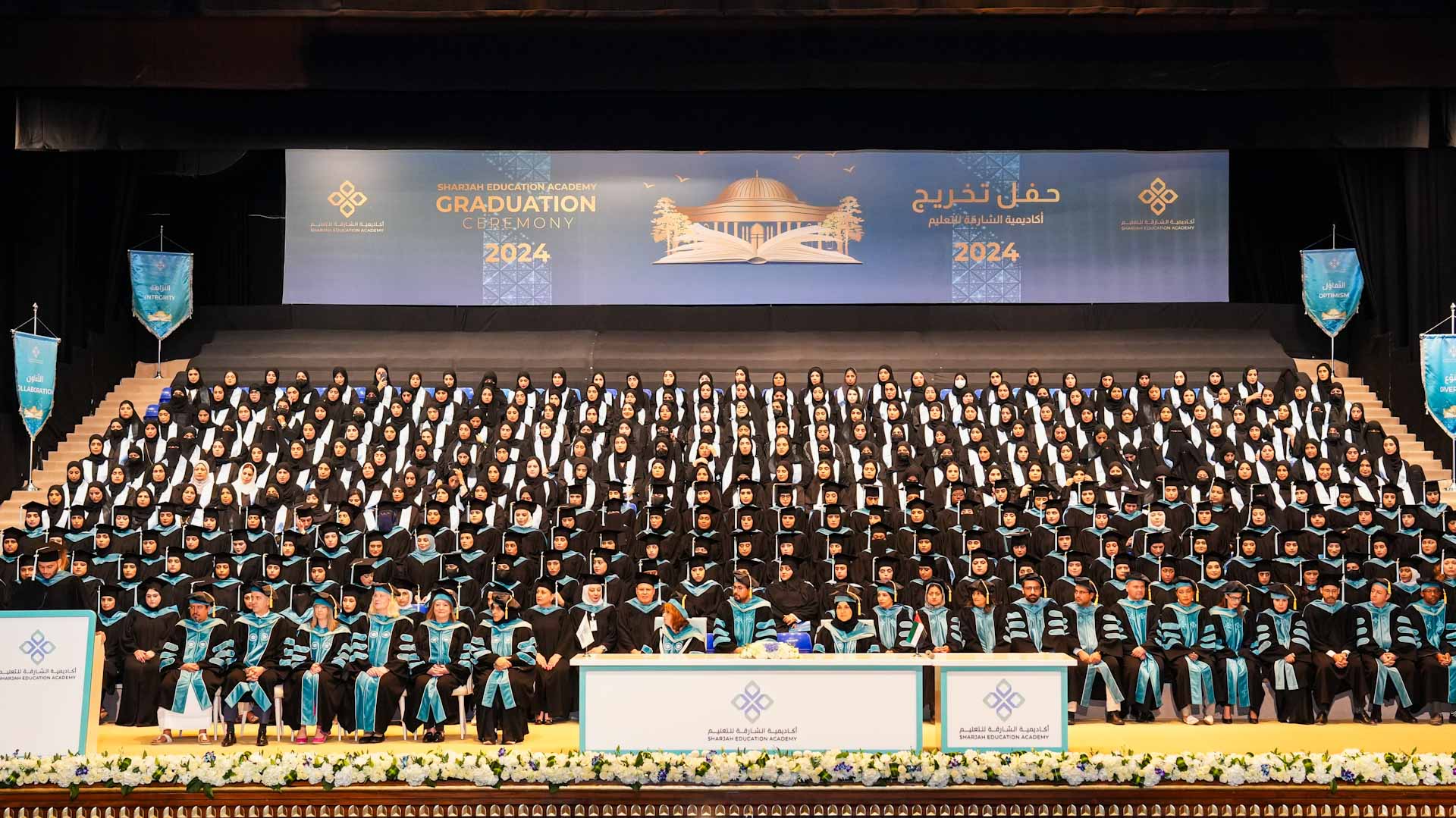The graduates recited the teacher’s oath, pledging to be faithful to the teaching profession and to protect their students in all circumstances. The President of the Sharjah Education Academy presented the graduates with their graduation certificates, congratulated them, and took souvenir photos with them.