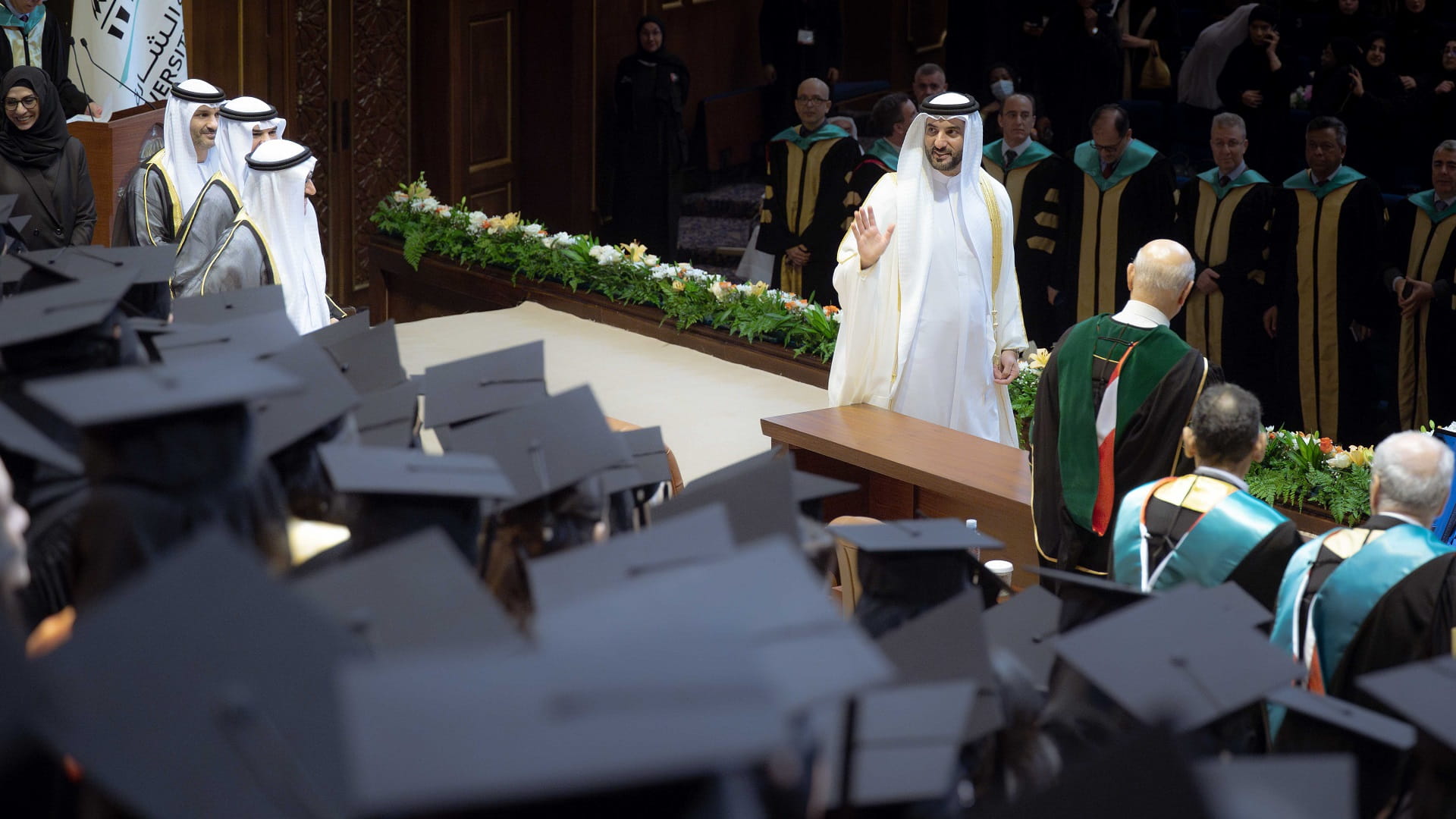 Graduate Al Anoud Al Ali gave a speech on behalf of her fellow graduates, reminding them of their dreams since childhood that have come true today. She said: “I stand before you to weave the fabric of the thoughts that we have had since childhood. We wrote down dreams and deposited them with caravans of wishes. We bid farewell to the caravan, but we did not forget the deposit. We went through life crawling, walking and running, and now we have joined the convoy of wishes, and the rows have been organised to receive deposits. Yesterday we sat in the halls and laboratories, and today we are eager to receive the certificates, and hear the congratulations and prayers. Yesterday’s dreams have become a beautiful reality today that we see on our beloved university's graduation and coronation podium.”