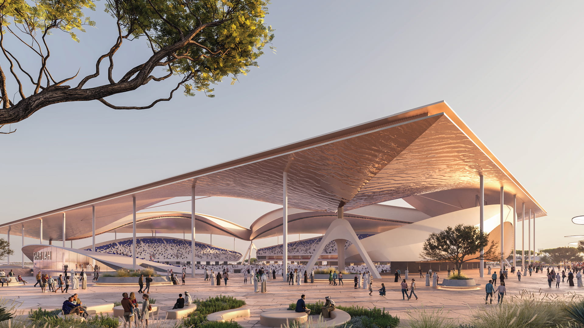 The structure consists of two parts: the platform and grandstand, which resemble the undulating sand dunes of the surrounding area, and a large cover in the shape of a bird with outstretched wings. The colour of this cover changes with the time of day—silver in the morning when sunlight reflects off it, and a golden-red hue at night.