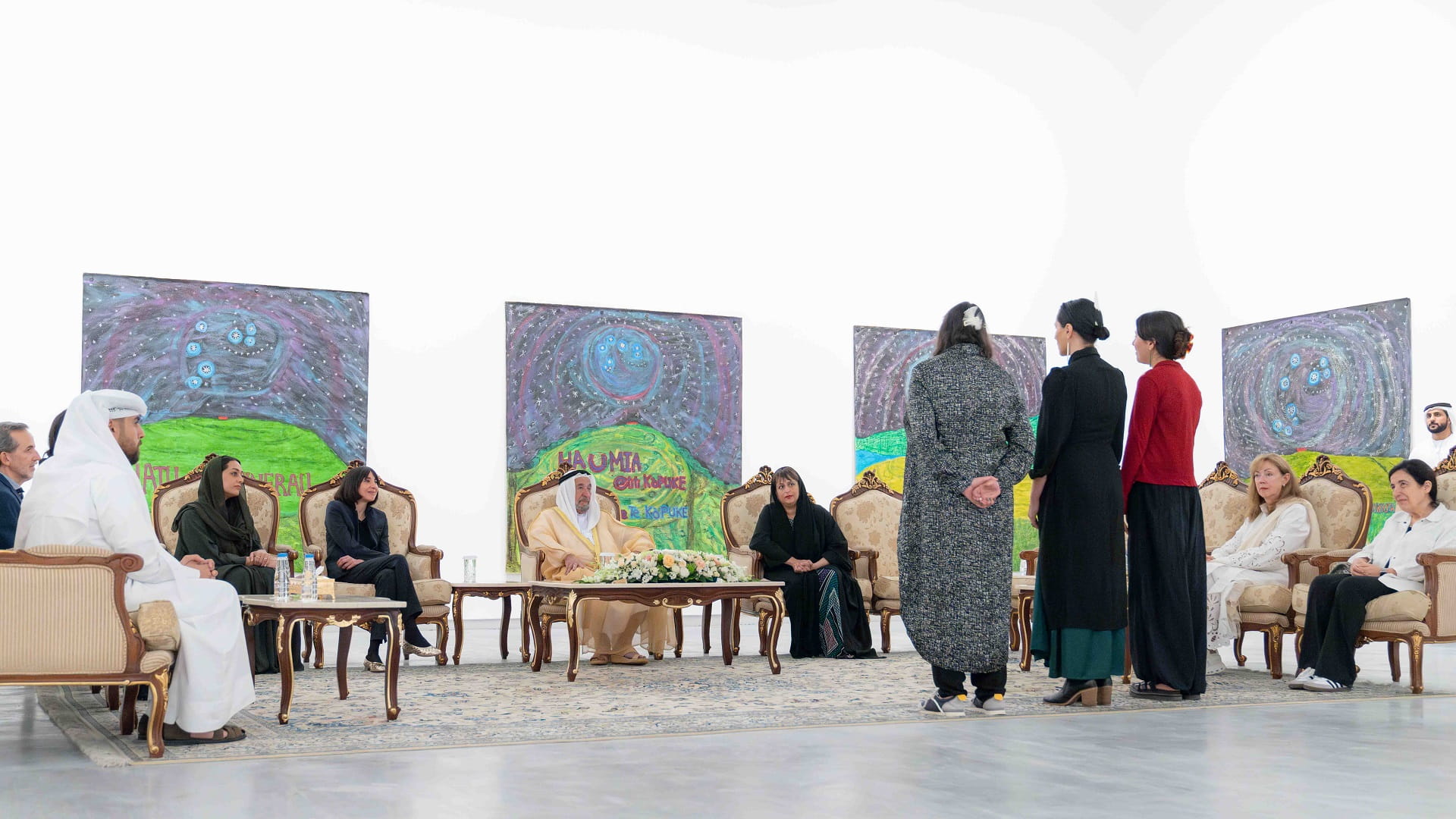 His Highness the Ruler of Sharjah viewed the exhibition of Maori artist Emily Karaka, which expresses the uniqueness of arts and their societal issues in the areas of her origins, which go back to the “Iwi” tribes present in the lands of Tāmaki Makaurau, the Auckland Isthmus, Waikato-Tainui, Ngāti Kahu and Ngāti Hine in New Zealand.