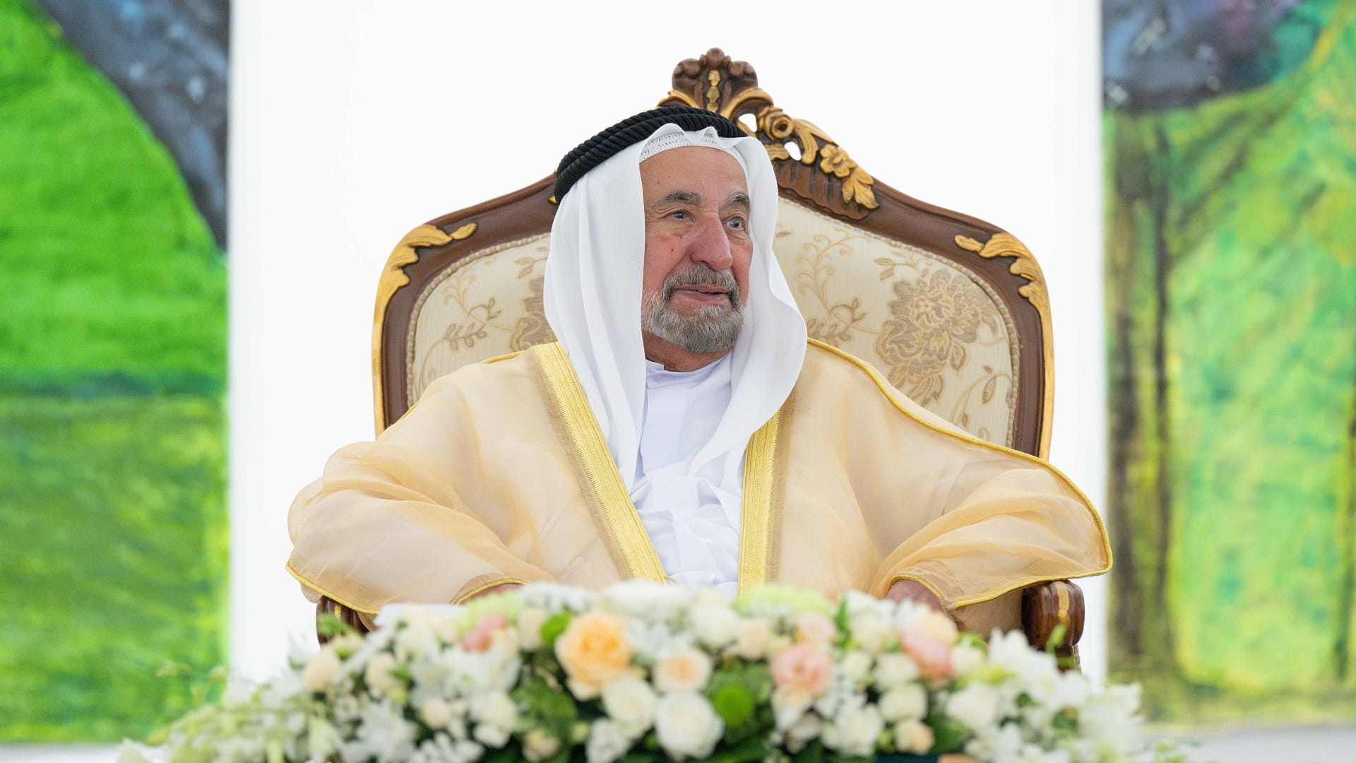 His Highness the Ruler of Sharjah listened to the artist Karaka’s detailed explanations during the tour, learning about her diverse works, which reflect her ideas and commitment as a well-known intellectual towards her community.