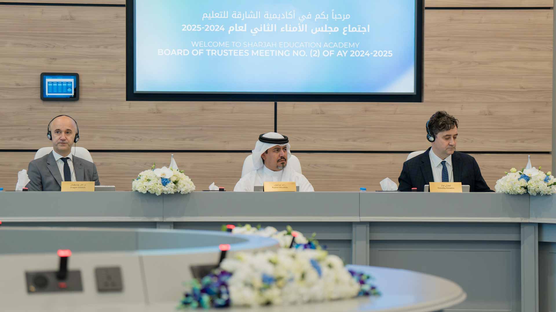The meeting was attended by His Highness the Ruler of Sharjah; Dr Muhadditha Al Hashimi, Chairperson of SPEA and Chairperson of the Board of Trustees of the Academy; Mohammed Obaid Al Shamsi, Director General of the Sharjah Social Security Fund (SSSF); Dr Najwa Al Hosani, Chancellor of the University of Kalba; Najla Al Midfa, Vice President of the Sharjah Entrepreneurship Centre (Sheraa); Dr Khawla Al Mulla, former Chairperson of the Family Affairs Authority; Dr Pauline Taylor Guy, Director of the Australian Institute for Educational Research; Dr Timothy Knowles, CEO of the Carnegie Foundation for the Advancement of Education in Britain; Michael Thompson, CEO of Child Peace Foundation in the United States; Dr Rashid Abu Shabas, Director of the Information Technology Department at Sharjah Private Education Authority (SPEA); Dr Dragan Jasevich, Director of the Learning Analytics Centre at Monash University in Australia; Khalaf Abdullah, Deputy CEO and Head of Internal Audit at Sharjah Islamic Bank Group; Dr Stephen Barnett, Founder and Co-Director of the National Institute for Early Childhood Education Research at Rutgers University in the United States; and Dr Kirsti Lonka, Professor of Educational Psychology at the University of Helsinki in Finland.