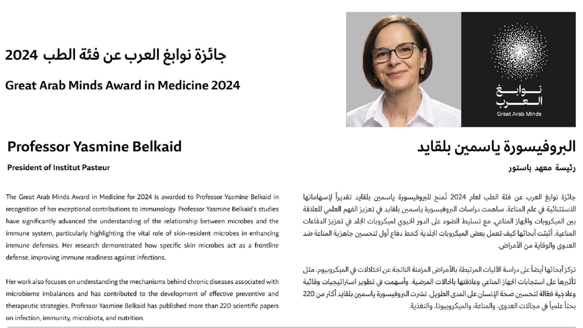 Sheikh Mohammed congratulated Professor Yasmine Belkaid, the winner of the 2024 Great Arab Minds Award in Medicine. Professor Belkaid, President of the Institut Pasteur in France, is recognised for her global achievements in scientific research and clinical studies in immunology, infectious diseases, microbiology, and tissue immunity.