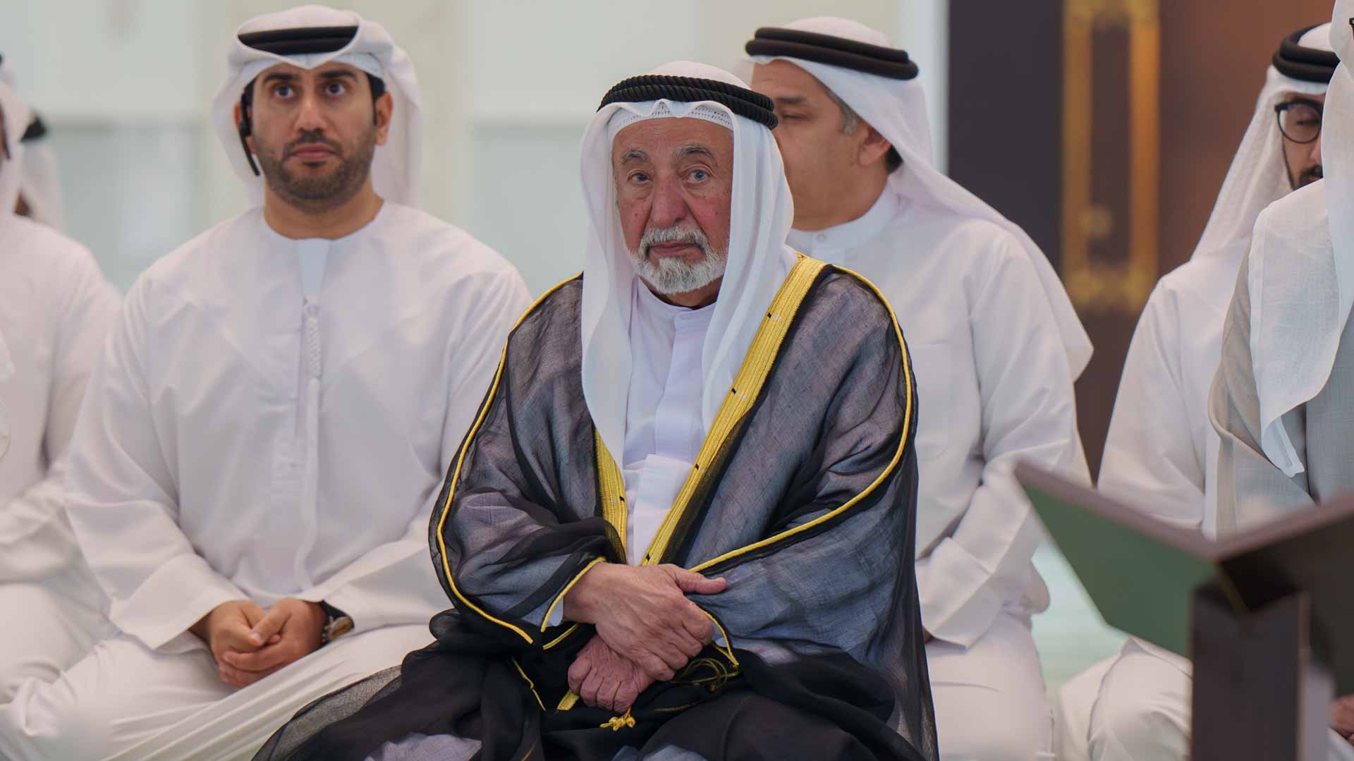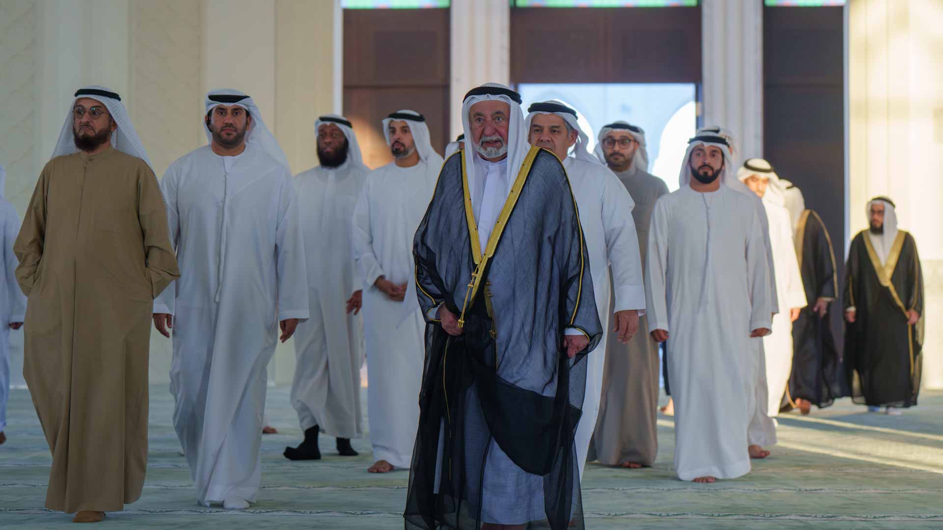 His Highness Sheikh Sultan bin Mohammed bin Sultan Al Qasimi, Crown Prince and Deputy Ruler of Sharjah; Sheikh Salem bin Mohammed bin Sultan Al Qasimi, Advisor at the Ruler’s Office; and Sheikh Abdullah bin Mohammed Al Qasimi, Director of the General Authority for Islamic Affairs and Endowments in Sharjah, along with several sheikhs, senior officials, and heads of government departments, welcomed His Highness upon his arrival at the mosque.