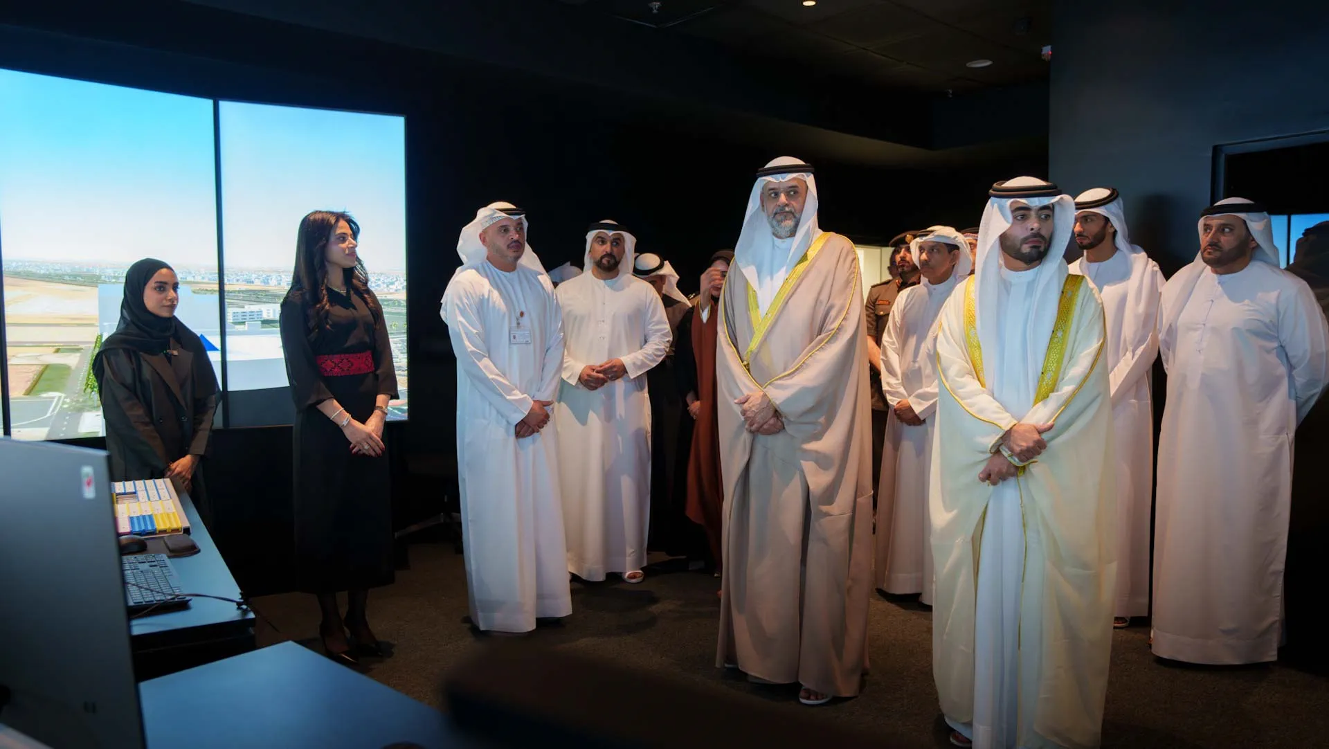 The Crown Prince and guests watched a presentation about the establishment of the Sharjah Training Centre for Airports Science, its services, and training programmes designed to prepare certified air traffic controllers and skilled local workforce ready for the aviation industry, equipped with the latest programmes and technologies.