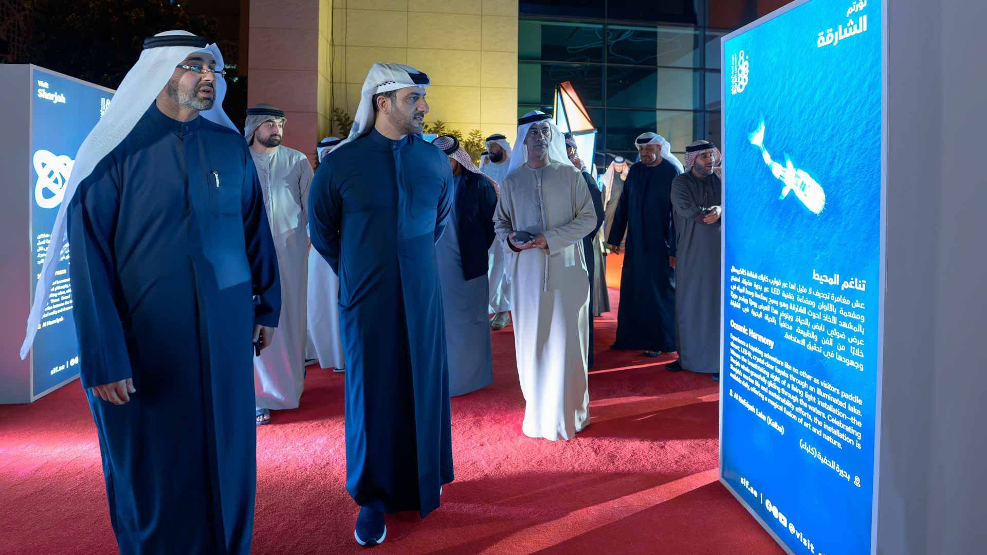 His Highness the Deputy Ruler of Sharjah was welcomed by Sheikh Khalid bin Essam Al Qasimi, Chairman of the Department of Civil Aviation; Sheikh Majid bin Sultan Al Qasimi, Chairman of the Department of Districts Affairs; Sheikh Saud bin Sultan bin Mohammed Al Qasimi, Director General of the Sharjah Digital Authority; Sheikh Salem bin Mohammed bin Salem Al Qasimi, Director of the Sharjah Commerce and Tourism Development Authority; along with several senior officials, government department heads, and a group of artists and media professionals.