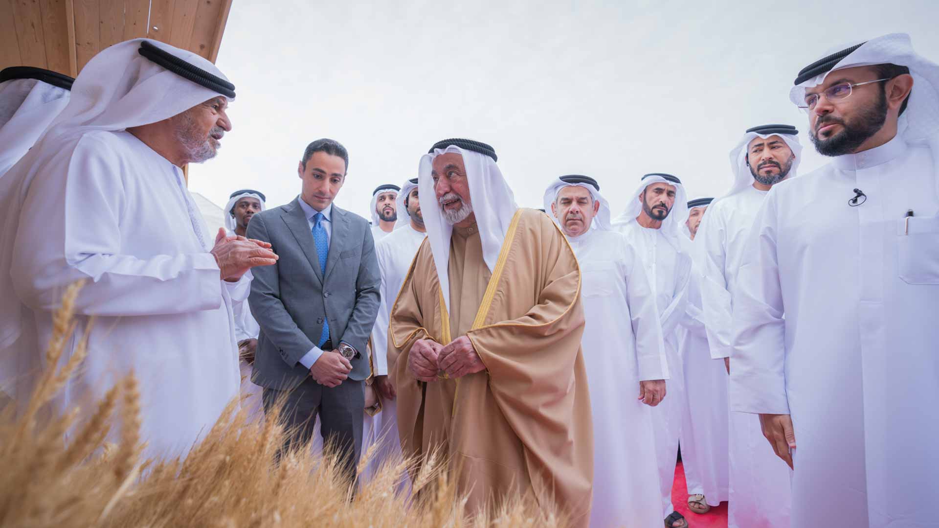 At the conclusion of the ceremony, His Highness the Ruler of Sharjah honoured the strategic partners whose support and collaboration played a significant role in the success of the third agricultural season of the Mleiha wheat farm. His Highness presented them with commemorative shields and took group photos in appreciation of their contributions.