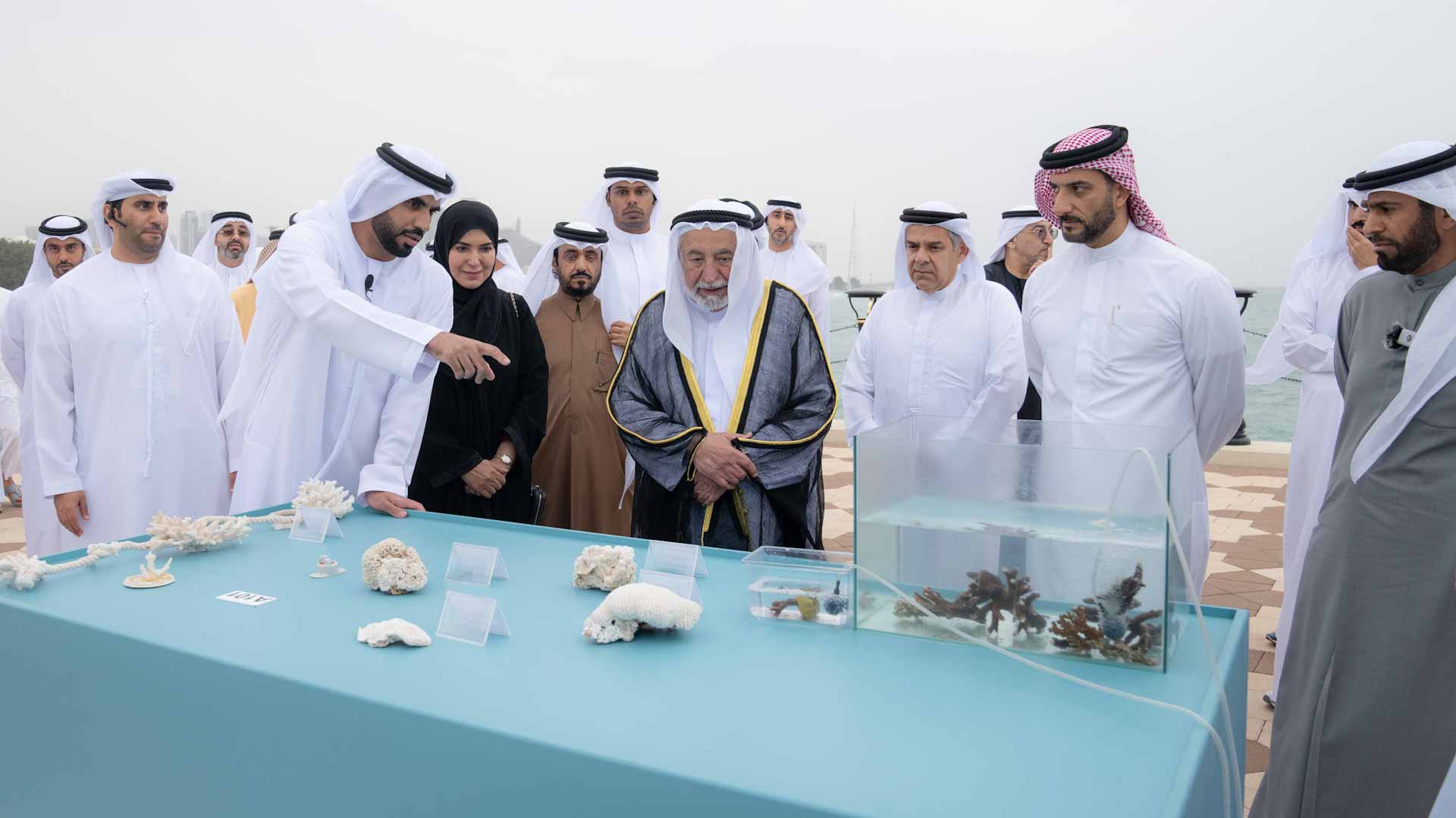 His Highness was also introduced to the Coral Reef Cultivation Initiative—Protecting the Marine Future, which aims to create natural habitats for marine life, enhance fish stocks, rehabilitate damaged marine environments, and promote marine biodiversity. He viewed a model of coral reefs from Sir Bu Nair Island and the cultivation techniques used. To mark the occasion, His Highness initiated the coral reef planting in the Al Layyah Canal breakwater.
