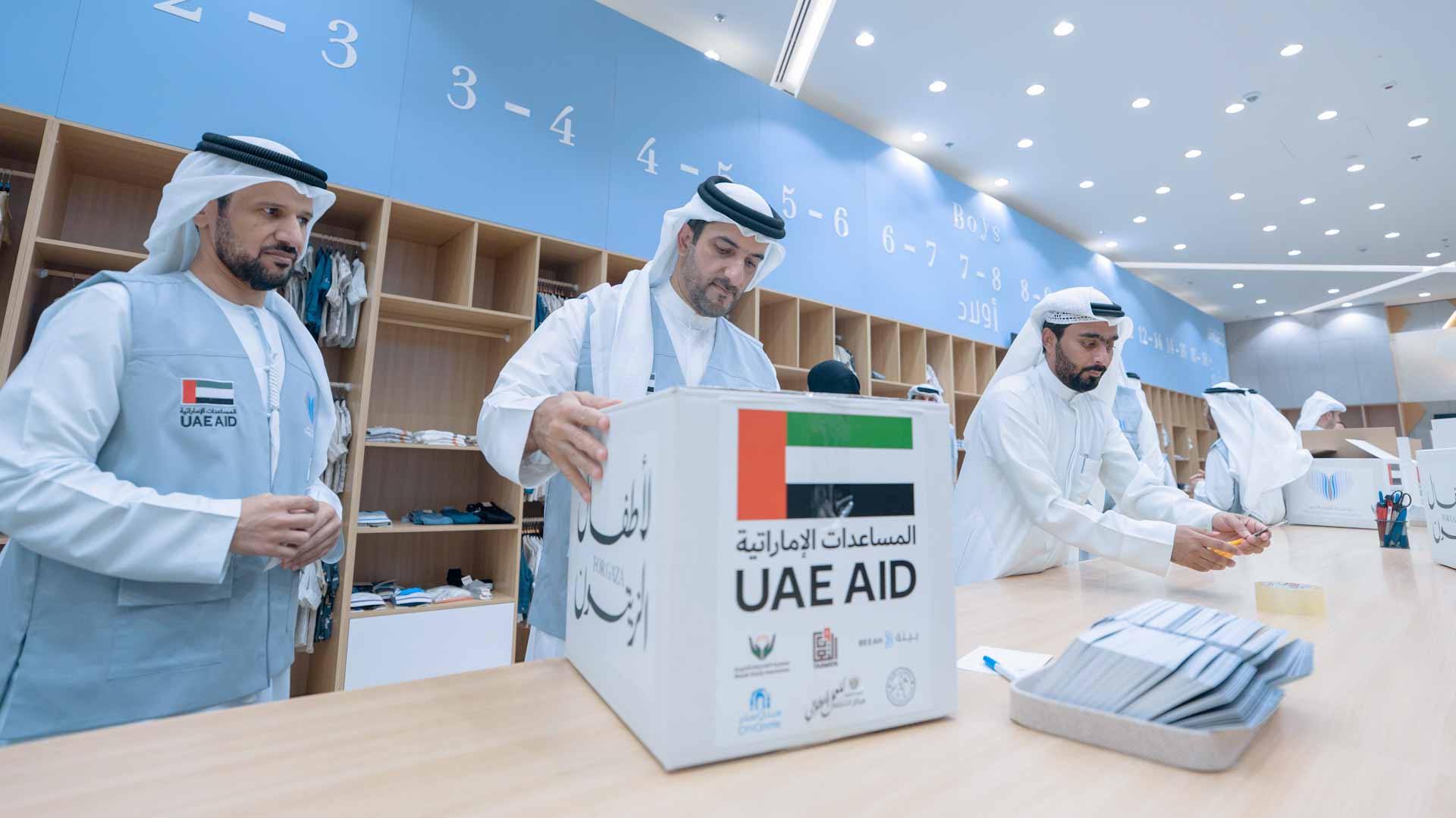 His Highness, The Big Heart Foundation's Humanitarian Envoy, received an overview of the initiative's goals, the process for packing and preparing boxes with children's supplies, and the efforts of the relevant authorities to ensure the timely delivery of new clothing and essentials to the children of Gaza, bringing joy and happiness to their hearts.