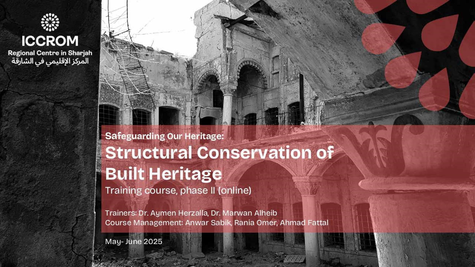 This course is part of the training and capacity-building programme at the ICCROM Regional Centre in Sharjah. The program aims to equip professionals with theoretical knowledge and practical skills for preserving and managing cultural heritage sites. The programme offers a master's degree in cultural heritage conservation management in collaboration with the University of Sharjah. Also, it provides seasonal training courses that focus on hands-on experience. These courses cover various aspects of conservation, including techniques, materials, and management strategies, ensuring that participants can effectively apply their learning in real-world scenarios.
