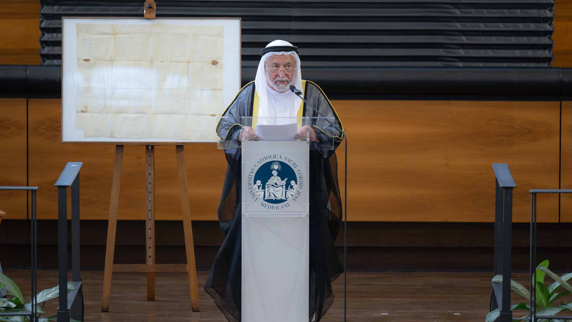 His Highness concluded his speech by addressing the audience, saying, "Ladies and gentlemen, today I present this manuscript as a gift to the Catholic University of the Sacred Heart, along with the book 'Papal Bull,' which is an investigation of that manuscript, to be placed in its rightful place in this esteemed university, in recognition of our academic collaboration."