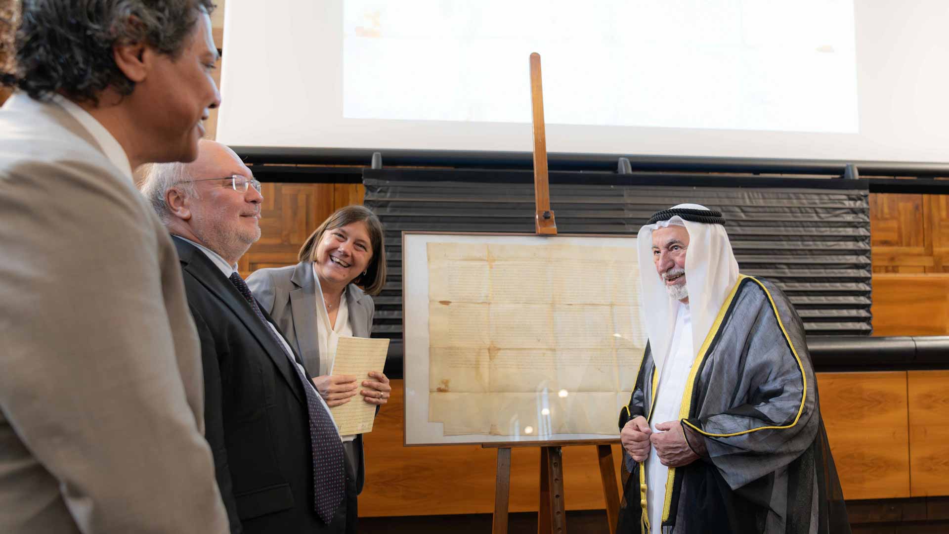 His Highness spoke about the manuscript he gifted to the university, which dates back to August 14, 1624, highlighting that it is a papal decree written by Pope Urban VIII and sealed in the Church of Santa Maria Maggiore. The purpose of the decree was to raise financial assistance for the Portuguese fleet.