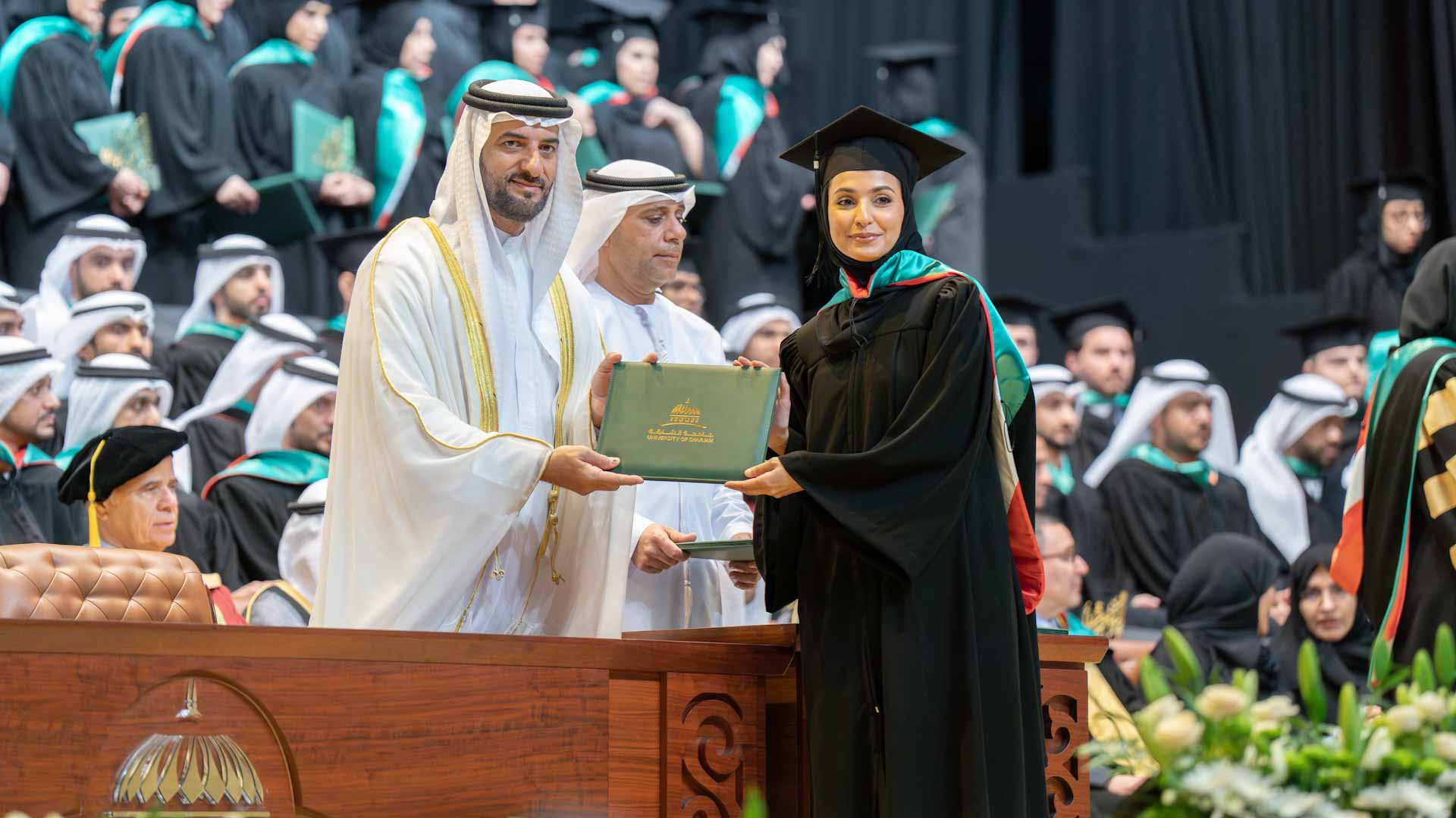 On behalf of the graduates, Sheikh Dr Salem bin Abdulrahman Al Qasimi delivered a speech expressing their pride and joy in standing on the graduation stage, celebrating the end of an exceptional academic journey and the beginning of a new phase of giving and responsibility. He noted that they carried dreams, faced challenges, and now reap the fruits of their efforts at the UOS—a beacon of knowledge and thought founded by His Highness the Ruler of Sharjah. He praised the inspiring vision and continuous support of the university’s President, who leads it toward global excellence and intellectual innovation across all disciplines.
