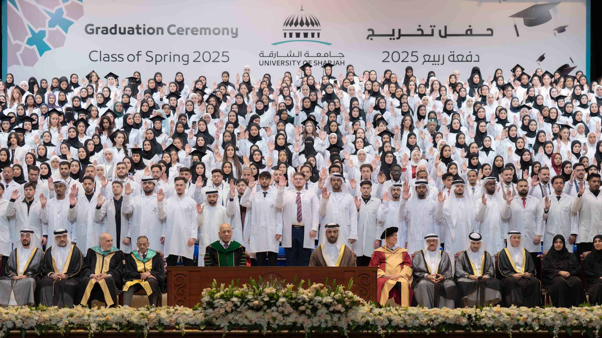 During the graduation ceremony, the graduates solemnly took the oath of medical and healthcare professionals in the presence of His Highness Sheikh Sultan bin Ahmed Al Qasimi, Deputy Ruler of Sharjah and President of the University of Sharjah, pledging to carry out their duties with dedication, integrity, and loyalty.
