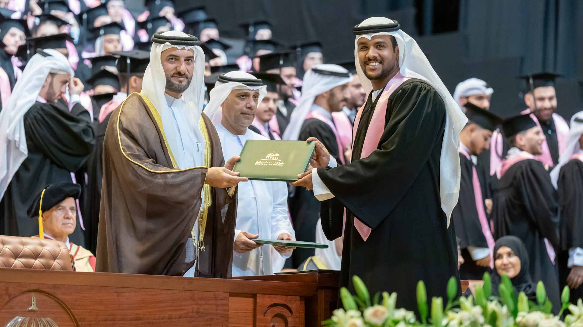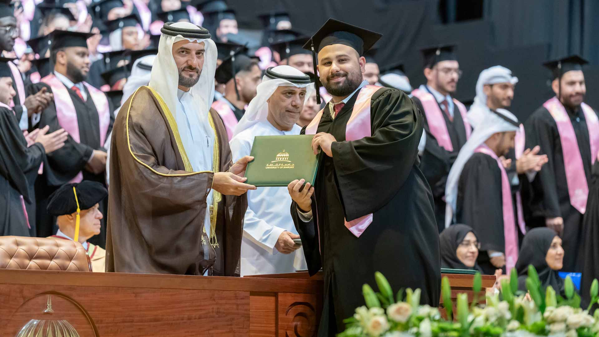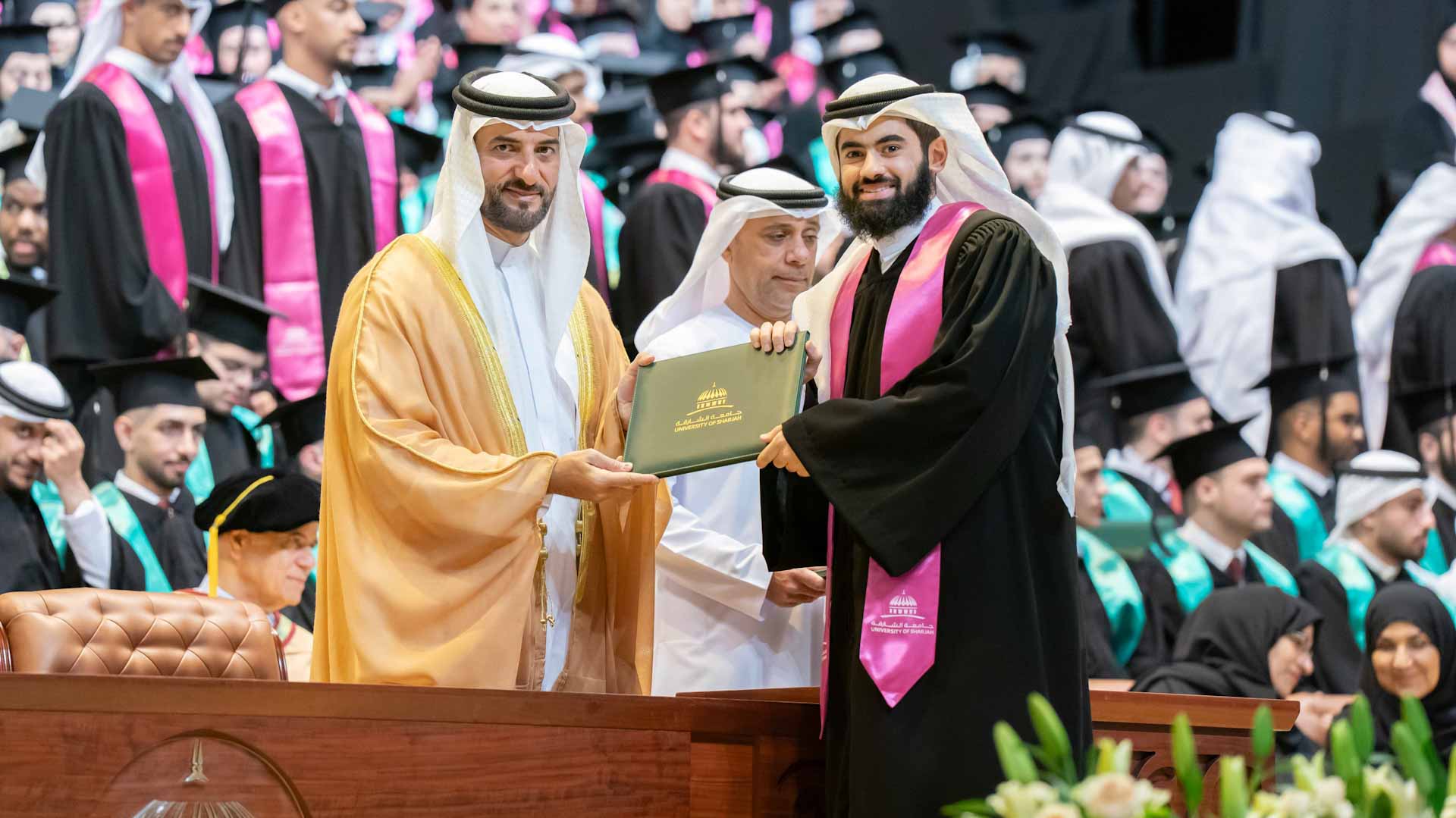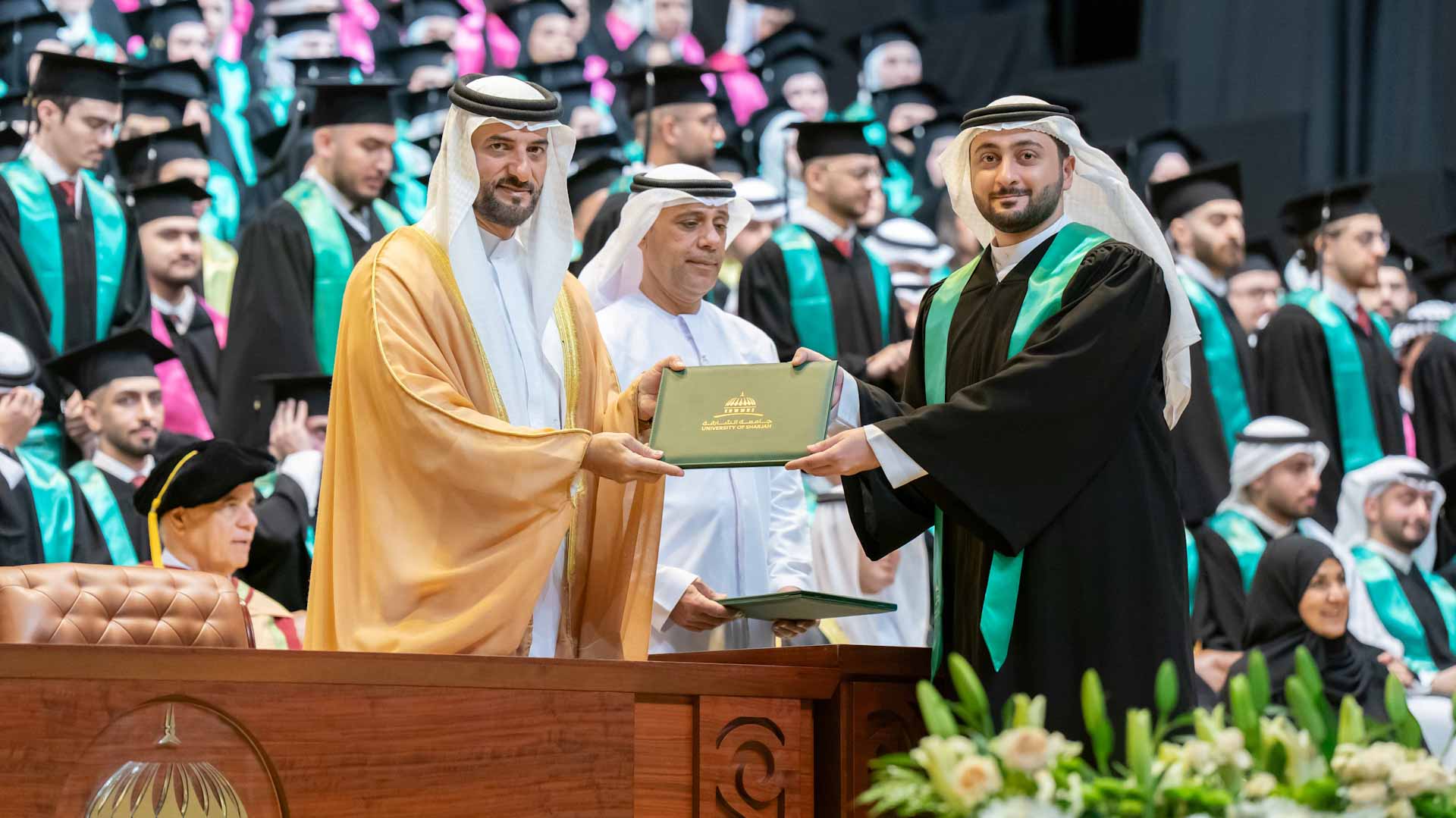 On behalf of the graduates, Ahmed Khalifa bin Ghalita from the medical colleges and Ali Nabil from the College of Health Sciences delivered speeches expressing their heartfelt gratitude to His Highness, the President of the University of Sharjah, for his continued support and patronage of the university and its students. They also thanked His Highness for attending and honouring the graduation ceremony with his presence.