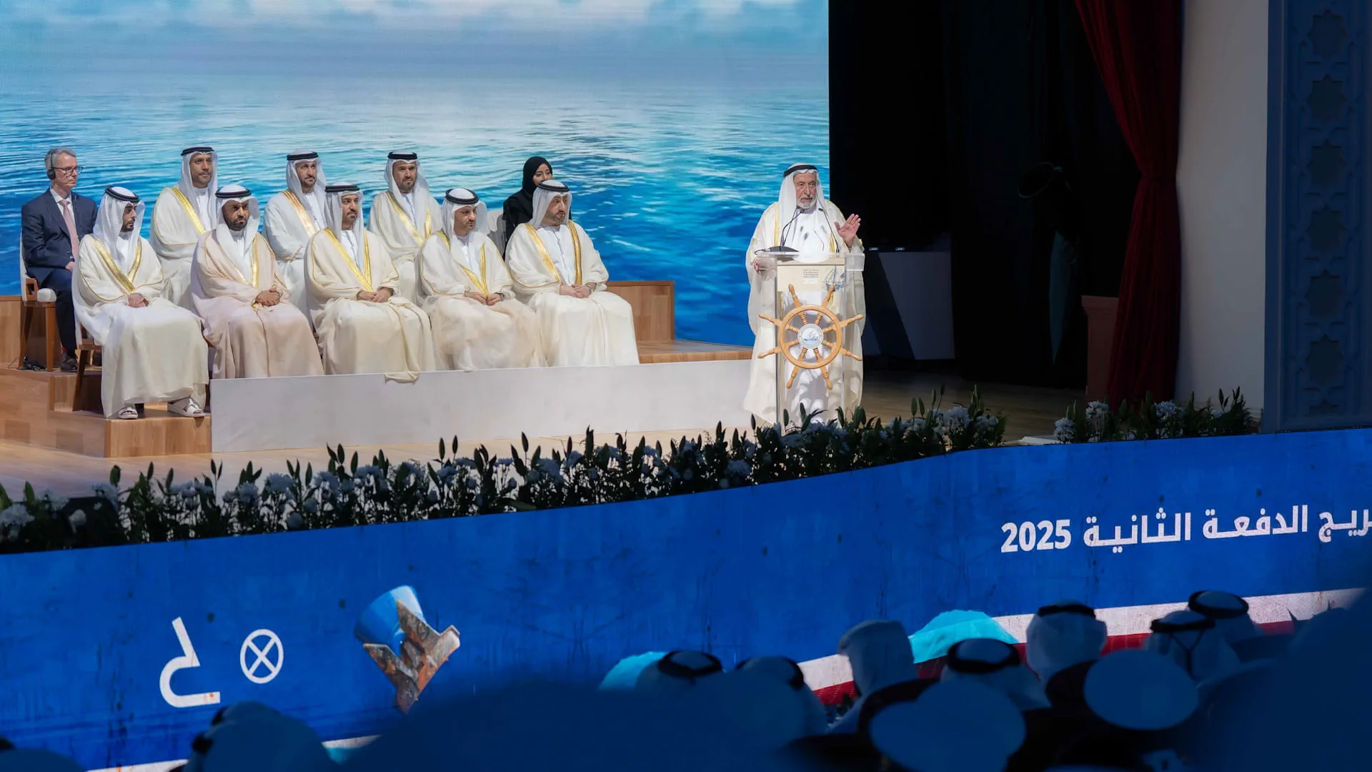 His Highness emphasised that the successful completion of the practical training by the Academy’s graduating students was the greatest achievement and a personal motivation for him. He expressed his confidence in the ability of his sons and daughters to overcome all challenges and hardships during their demanding training in the distant depths of the seas, thanks to the high-quality programs offered by the Academy. He said: “Many people fear even the sound of waves, let alone these young blossoms who bravely endured the sea. Our hearts are with them, our sons and daughters, in every training session. These graduates have been granted useful work and self-confidence, both from the professors and the administration of the Academy, and have now reached this remarkable level. Congratulations to you, to us, to your sons and daughters, and to our Academy which is now reaching the highest international standards.”