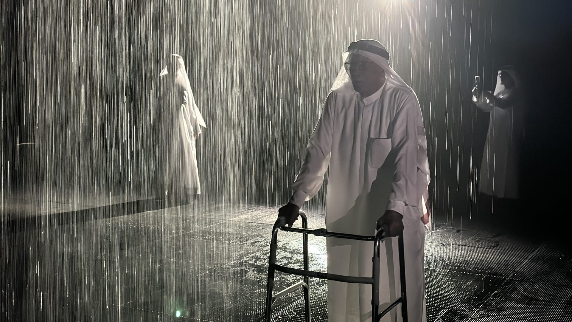 The tour continued at the "Rain Room," an interactive art installation where visitors can experience walking through rain without getting wet, thanks to smart technology. The young volunteers helped the elderly enjoy this experience, showcasing moments of kindness and responsibility.