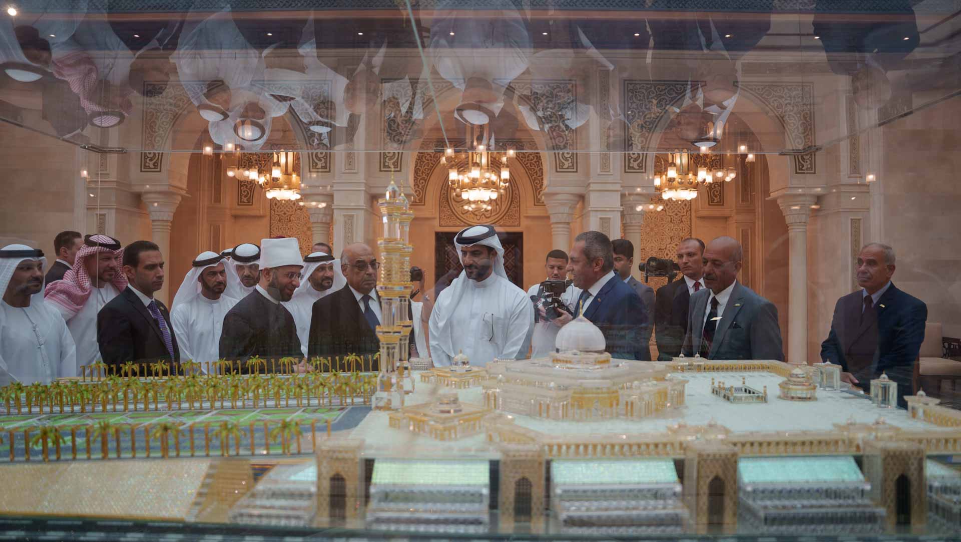 His Highness explored the beautifully adorned corridors featuring Quranic verses, which led him to the Quran halls. Each of the 30 rooms in the halls is dedicated to a specific part of the Holy Quran, with walls intricately carved to showcase complete sections of the text. These rooms are also equipped with listening devices designed to facilitate the memorization of the Holy Quran. His Highness examined the centre's comprehensive layout, admired the aesthetic designs, and appreciated the murals inscribed with Quranic verses. His Highness also took note of the centre’s collection of notable historical Qurans and religious artifacts.