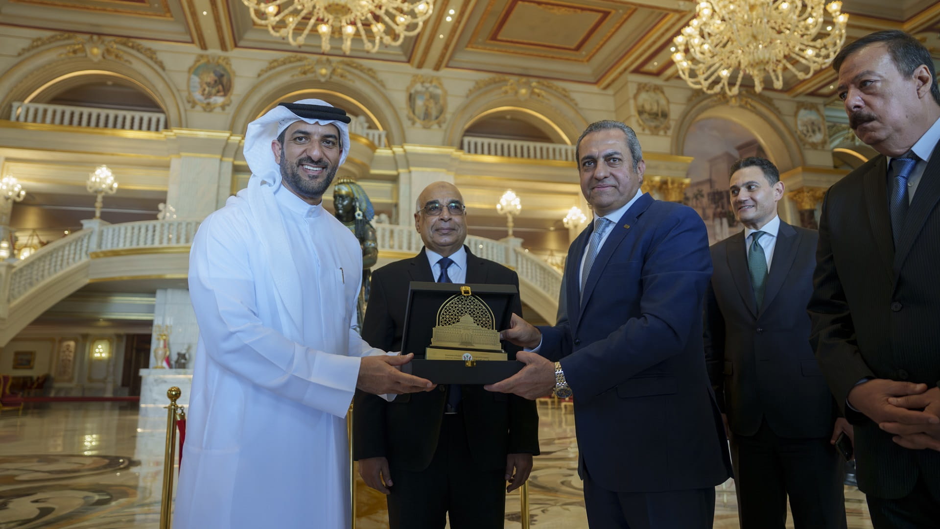 His Highness inscribed a message in the House's VIP Book, stating, "I was truly honored to visit the City of Arts and Culture. My heartfelt thanks and appreciation go to everyone responsible for this magnificent cultural landmark." Following this, His Highness and the Egyptian delegation exchanged commemorative shields and gathered for group photos.