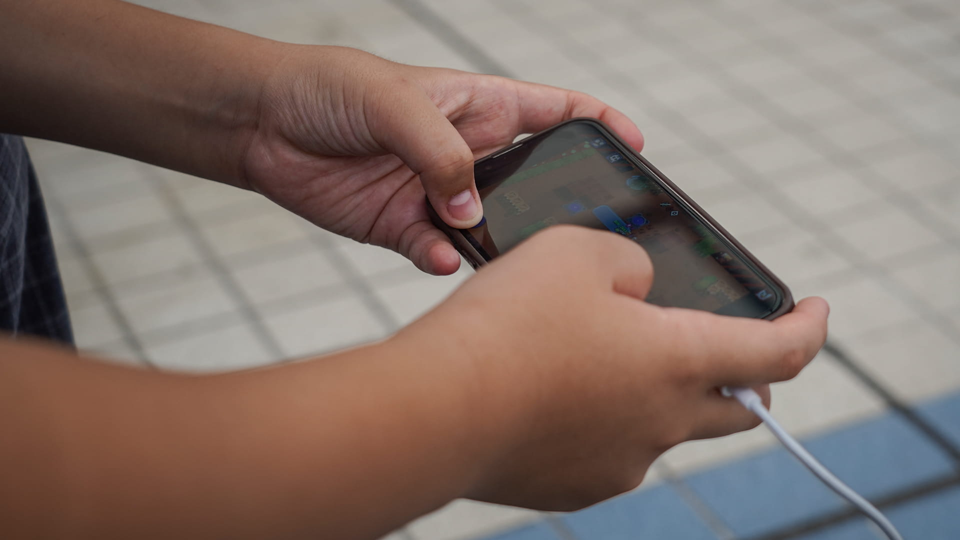 Ikka Ito, a middle school student playing a video game near a local station, uses his phone for four to five hours a day.
