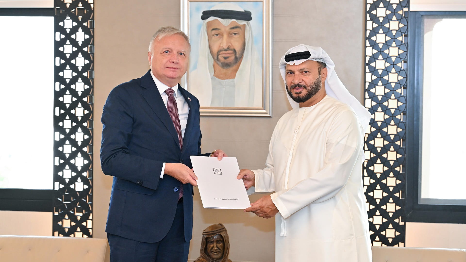 His Highness the President and the Slovak Prime Minister also witnessed the exchange of a cooperation agreement in the economic field between the governments of the UAE and Slovakia, as well as a memorandum of understanding in the field of investment. The agreements were exchanged on behalf of the UAE by Dr Thani bin Ahmed Al Zeyoudi, Minister of Foreign Trade, and on behalf of Slovakia by Vladimír Šimoňák, State Secretary at the Ministry of Economy.