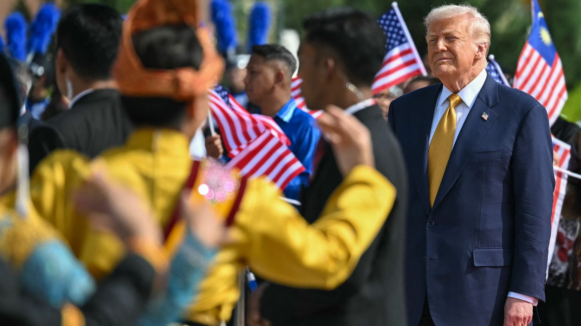 During a refueling stop en route, Trump met Qatari officials to discuss the fragile Gaza truce. His arrival in Malaysia featured a red-carpet welcome and a military fly-over by two F-18 jets.